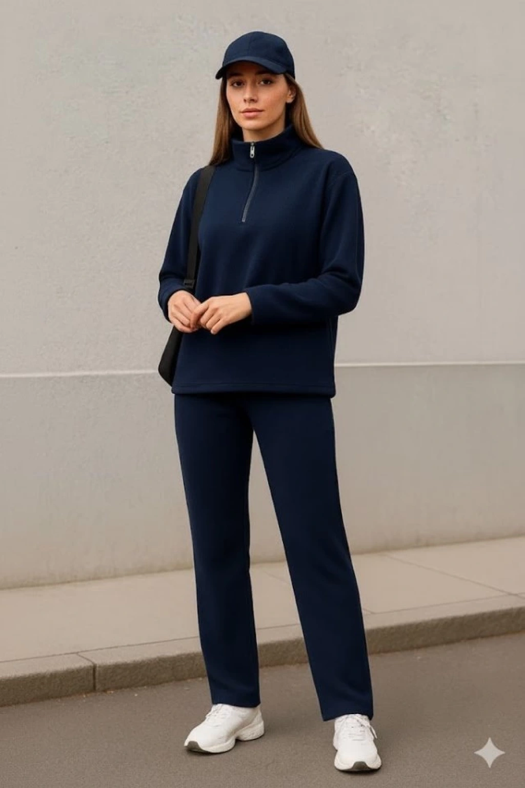Kadın Balıkçı Yaka Fermuar Detay Polar Sweat Ve Pantolon Ikili Takım