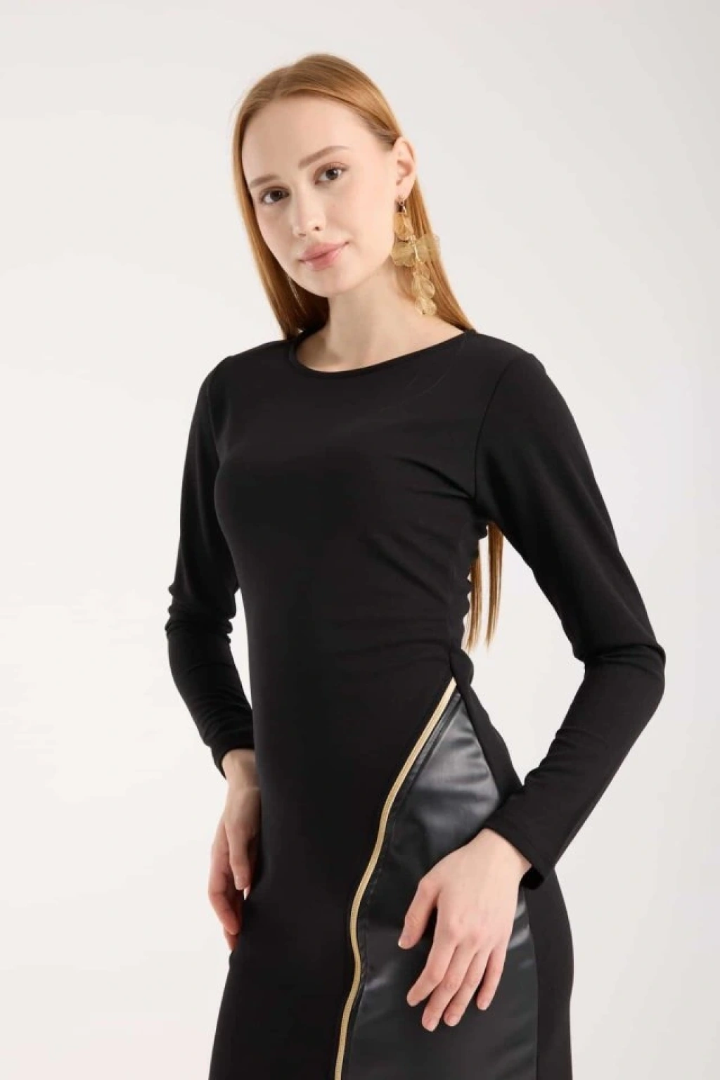Kadın Bisiklet Yaka Uzun Kollu Deri Ve Fermuar Detay Mini Yırtmaçlı Elbise