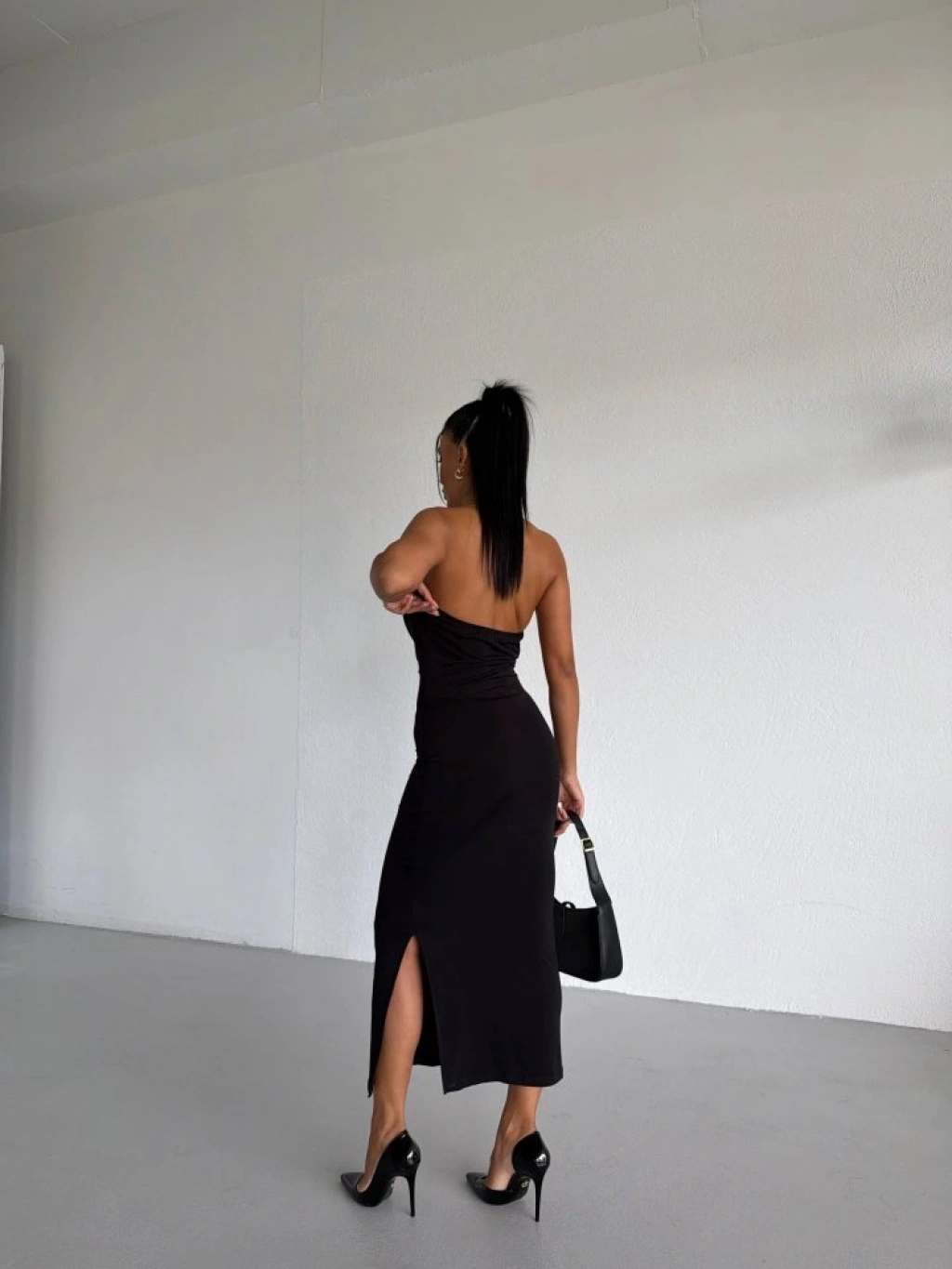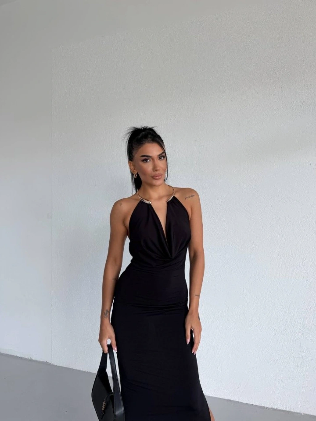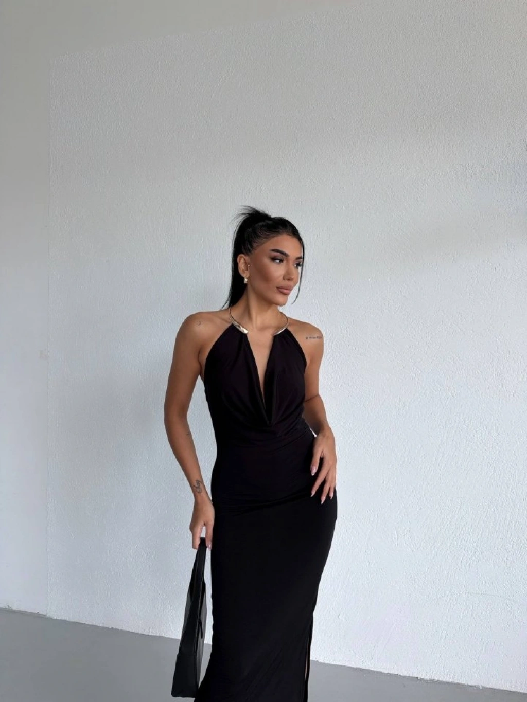 Kadın Boyun Aksesuarlı Halter Yaka Maxi Boy Sandy Kumaş Elbise