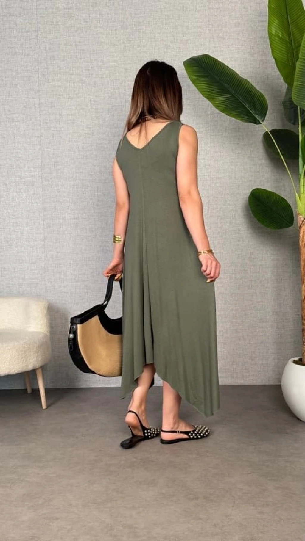 Kadın çan Dokuma Kumaş V Yaka Asimetrik Kesim Elbise