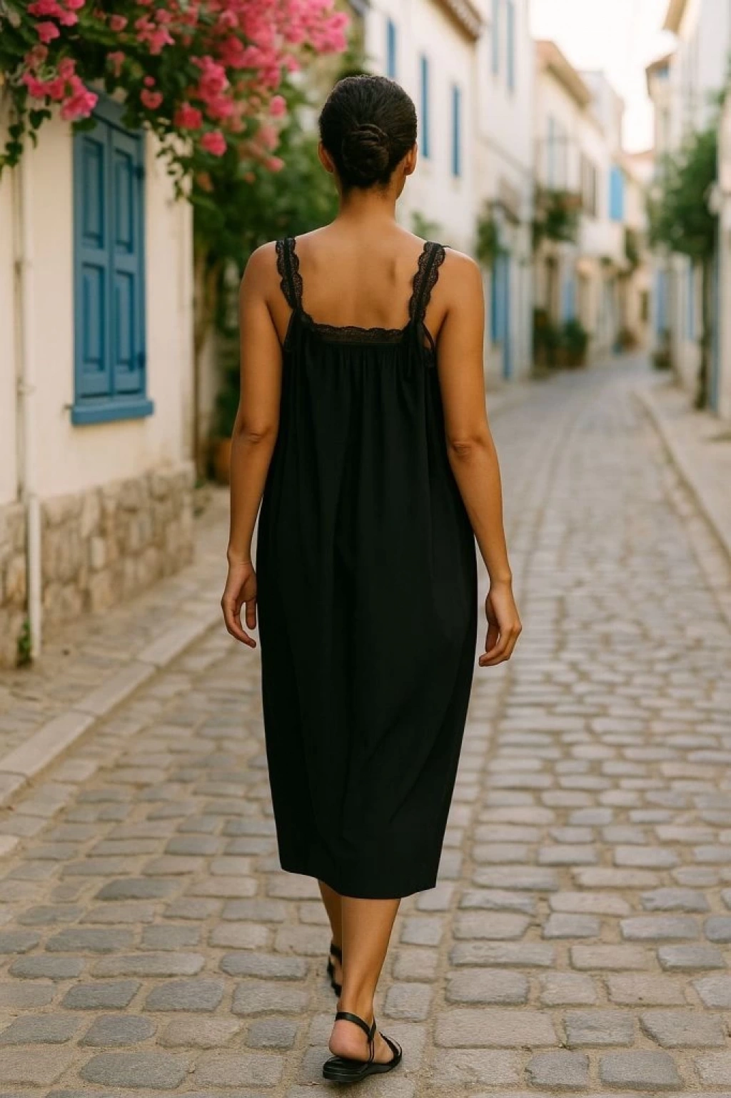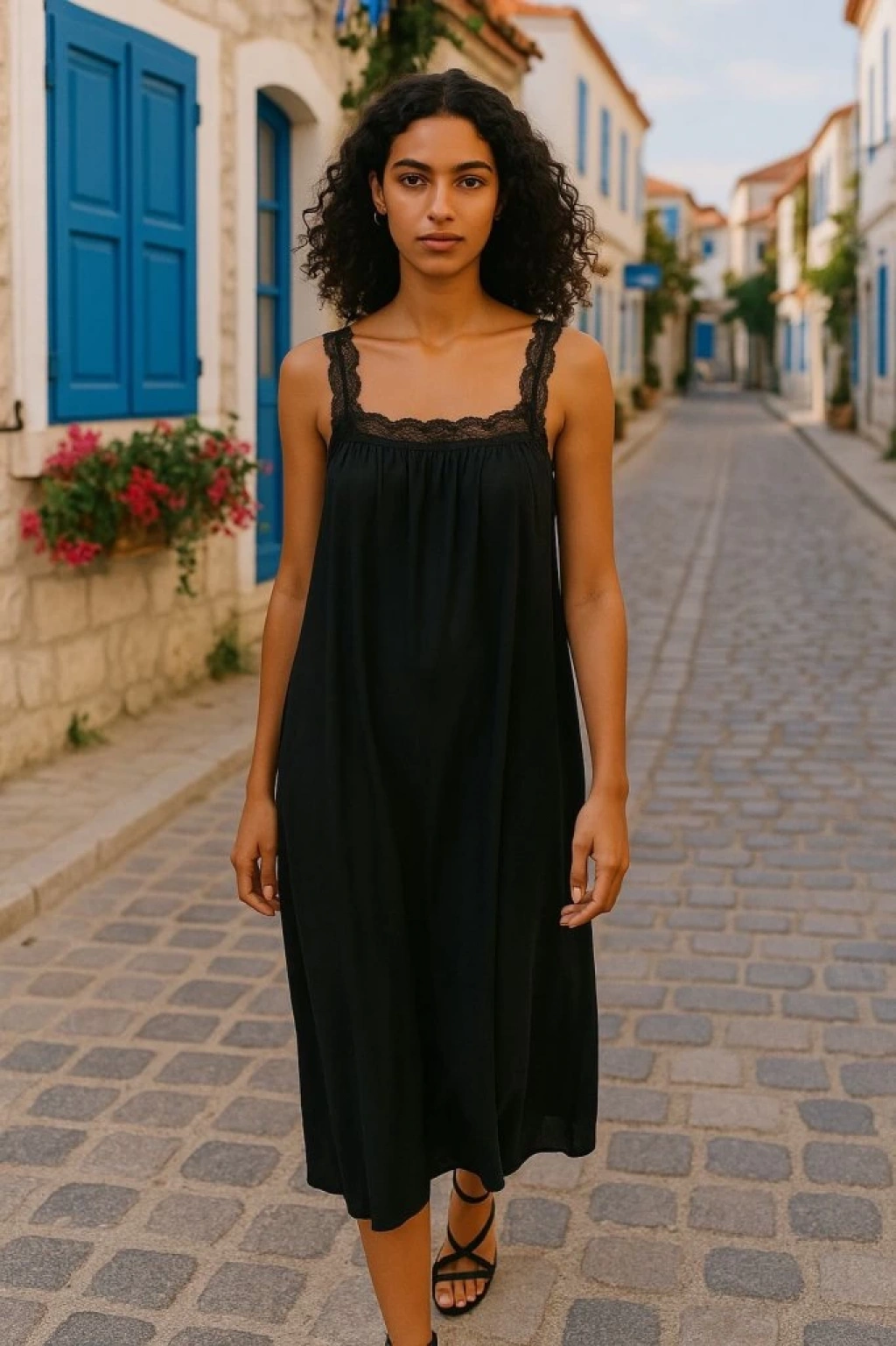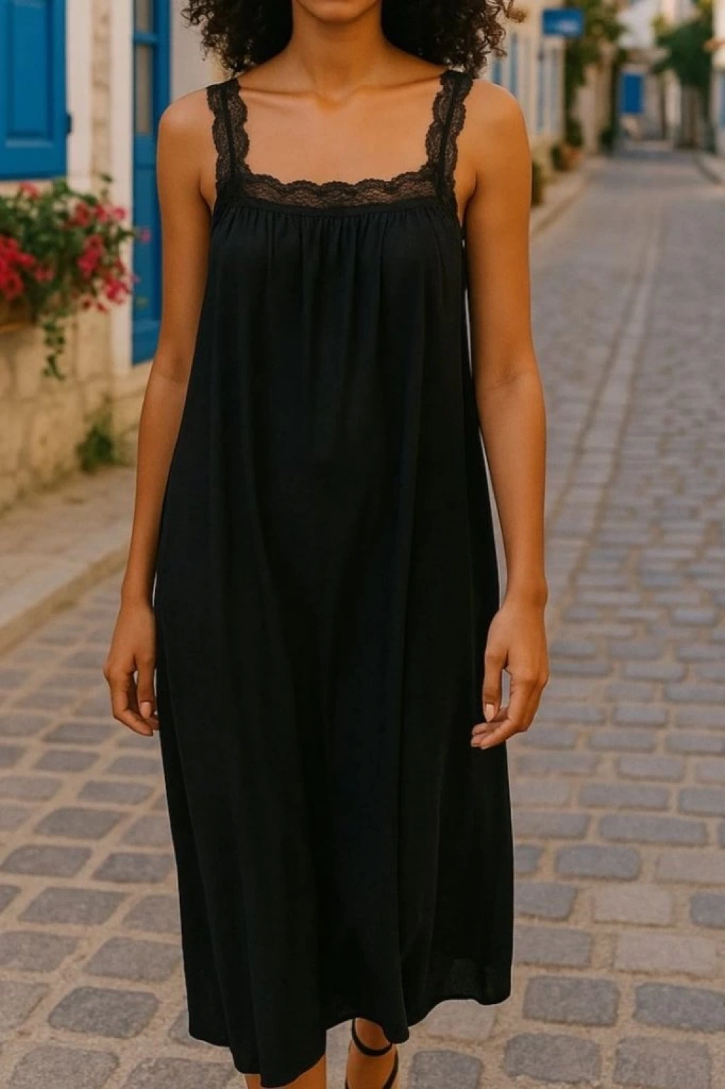 Kadın Dantel Askılı Kare Yakalı Uzun Viskon Elbise