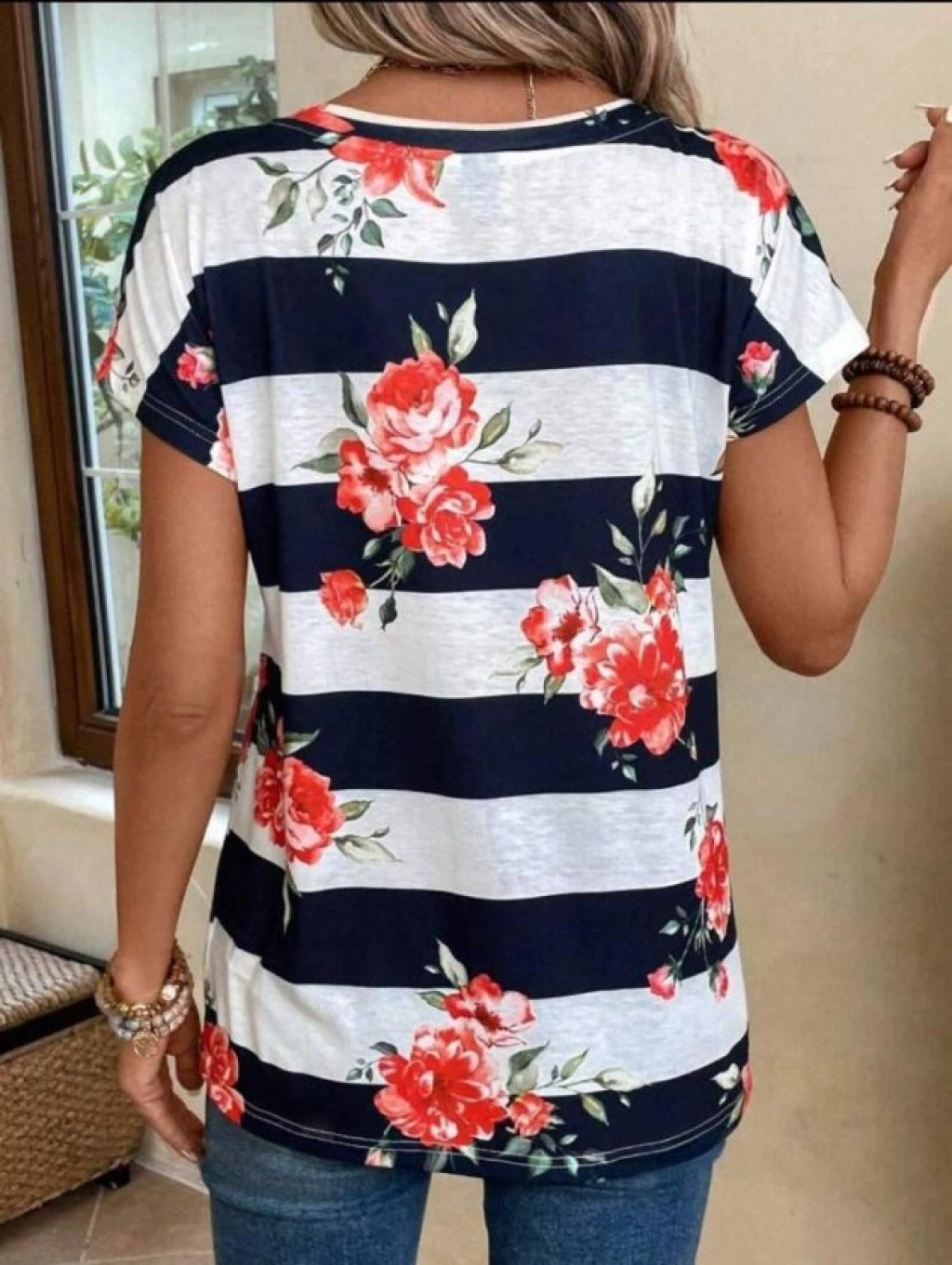 Kadın Gül Desenli çizgili Süprem Tshirt