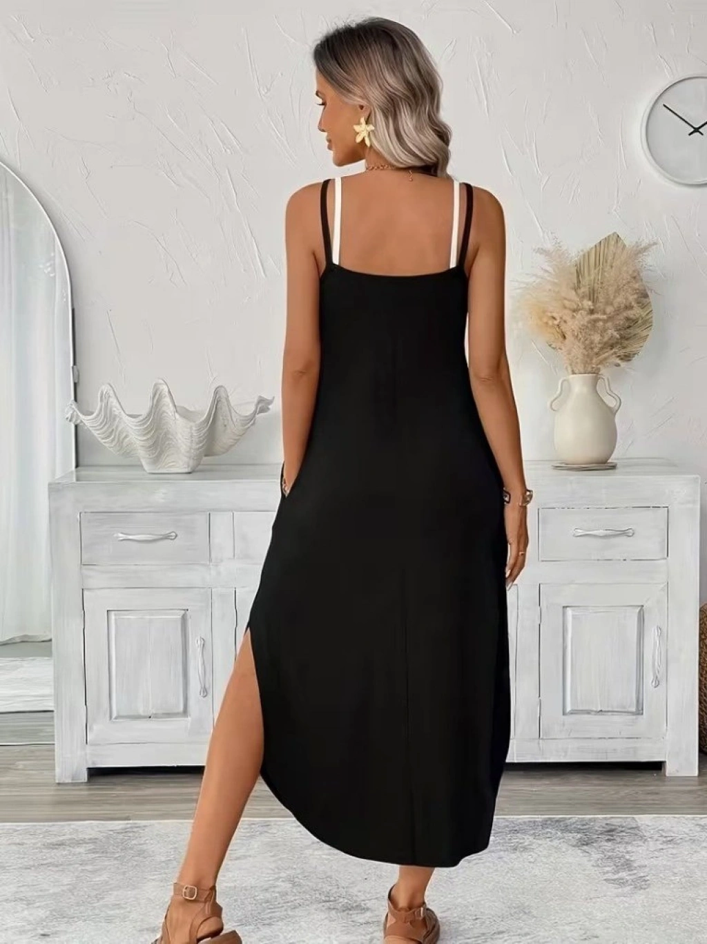 Kadın Ip Askılı Yuvarlak Yakalı Cepli Uzun Viskon Elbise