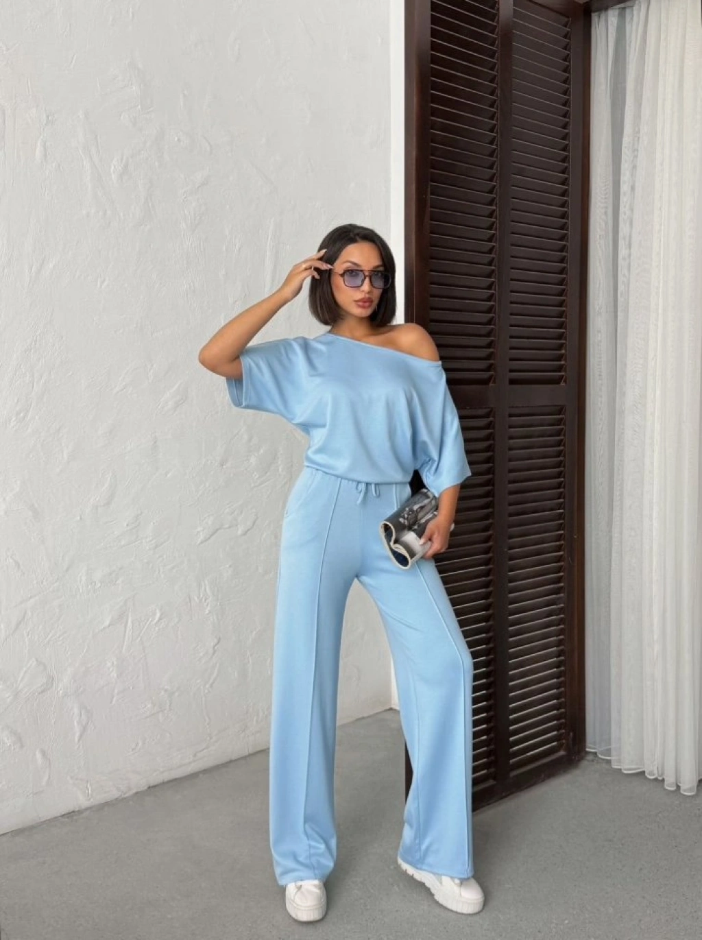 Kadın İsa Kollu Kayık Yaka Bluz Ve Pantolon Misal Kumaş Ikili Takım