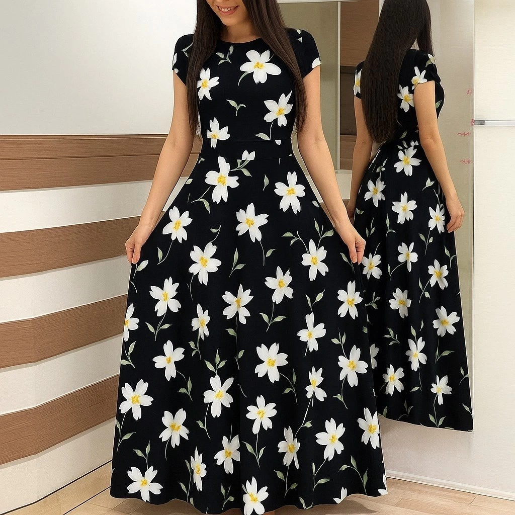 Kadın Kısa Kollu Bisiklet Yaka Puantiyeli Maksi örme Krep Elbise