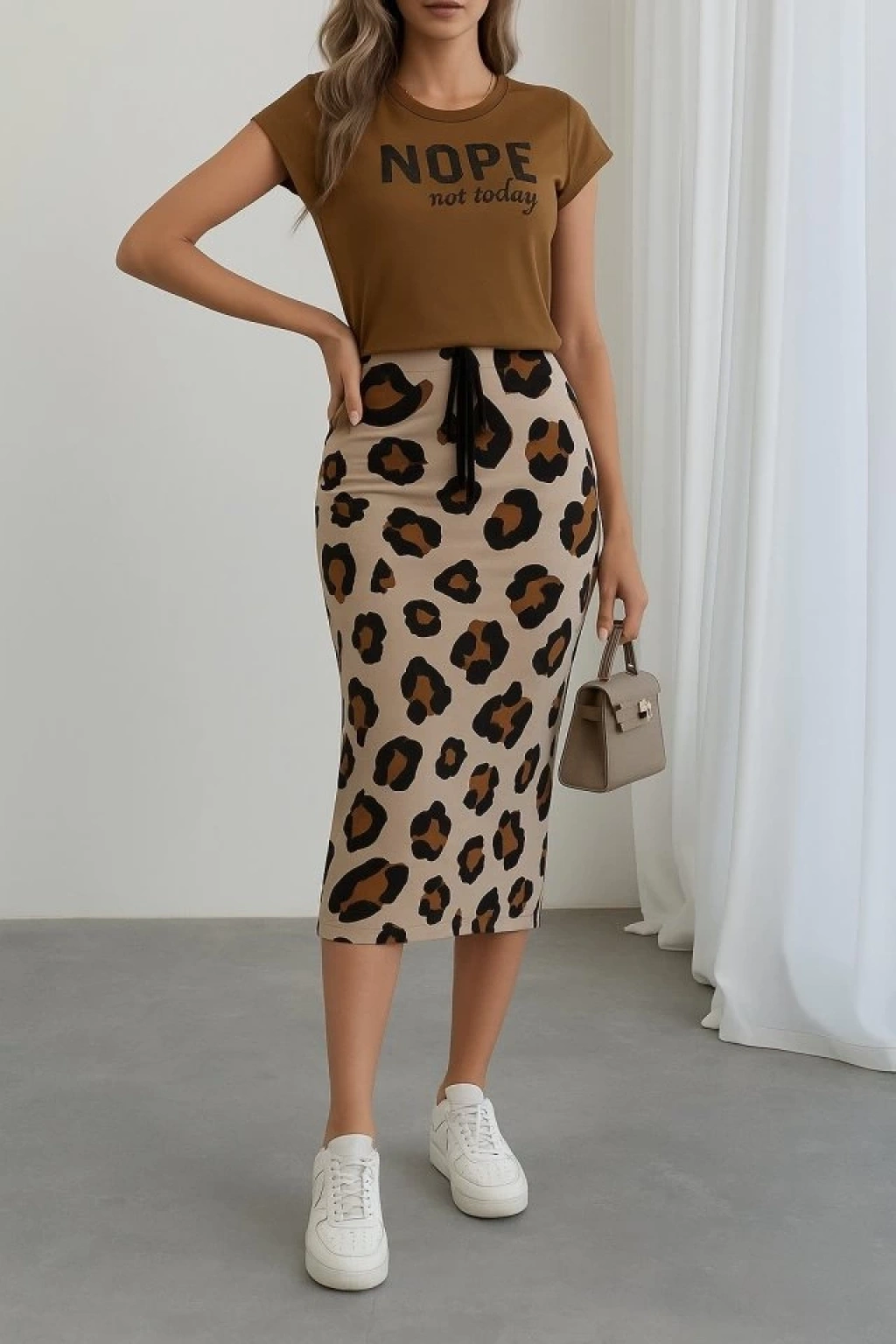 Kadın Kısa Kollu Bisiklet Yaka Viskon Bluz Desenli Dalgıç Etek Ikili Takım