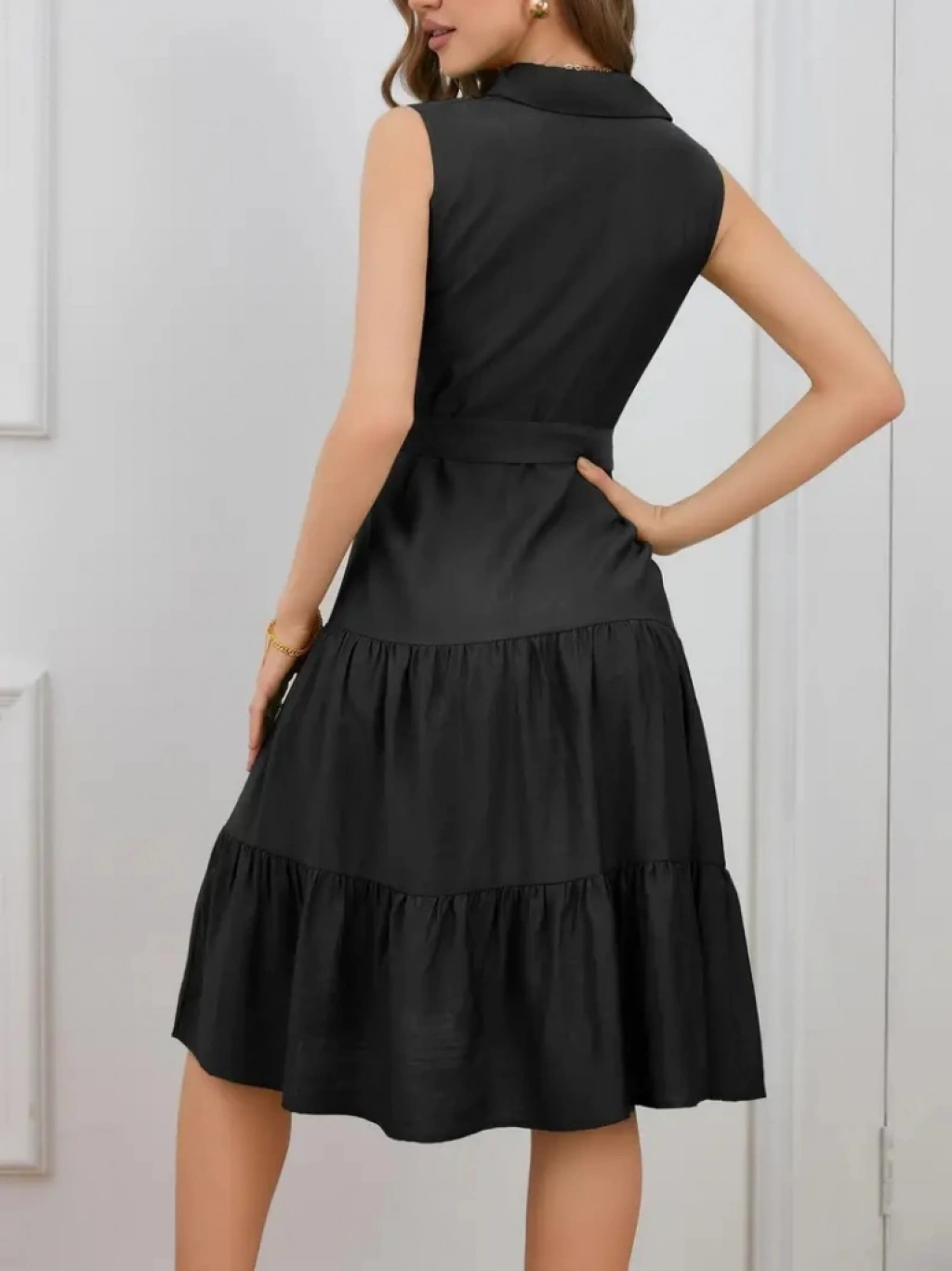 Kadın Kısa Kollu Gömlek Yaka Düğmeli Beli Kuşaklı Katlı Dokuma Midi Elbise