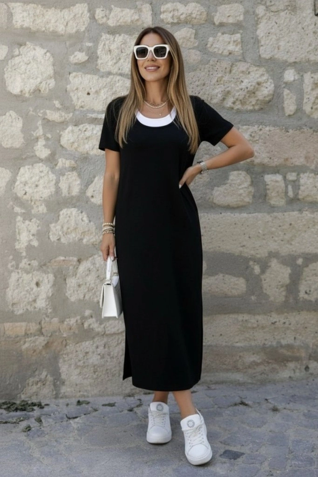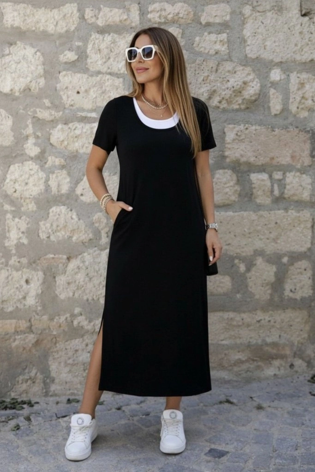 Kadın Kısa Kollu Içi Atlet Görünümlü Yandan Yırtmaçlı Uzun Viskon Elbise