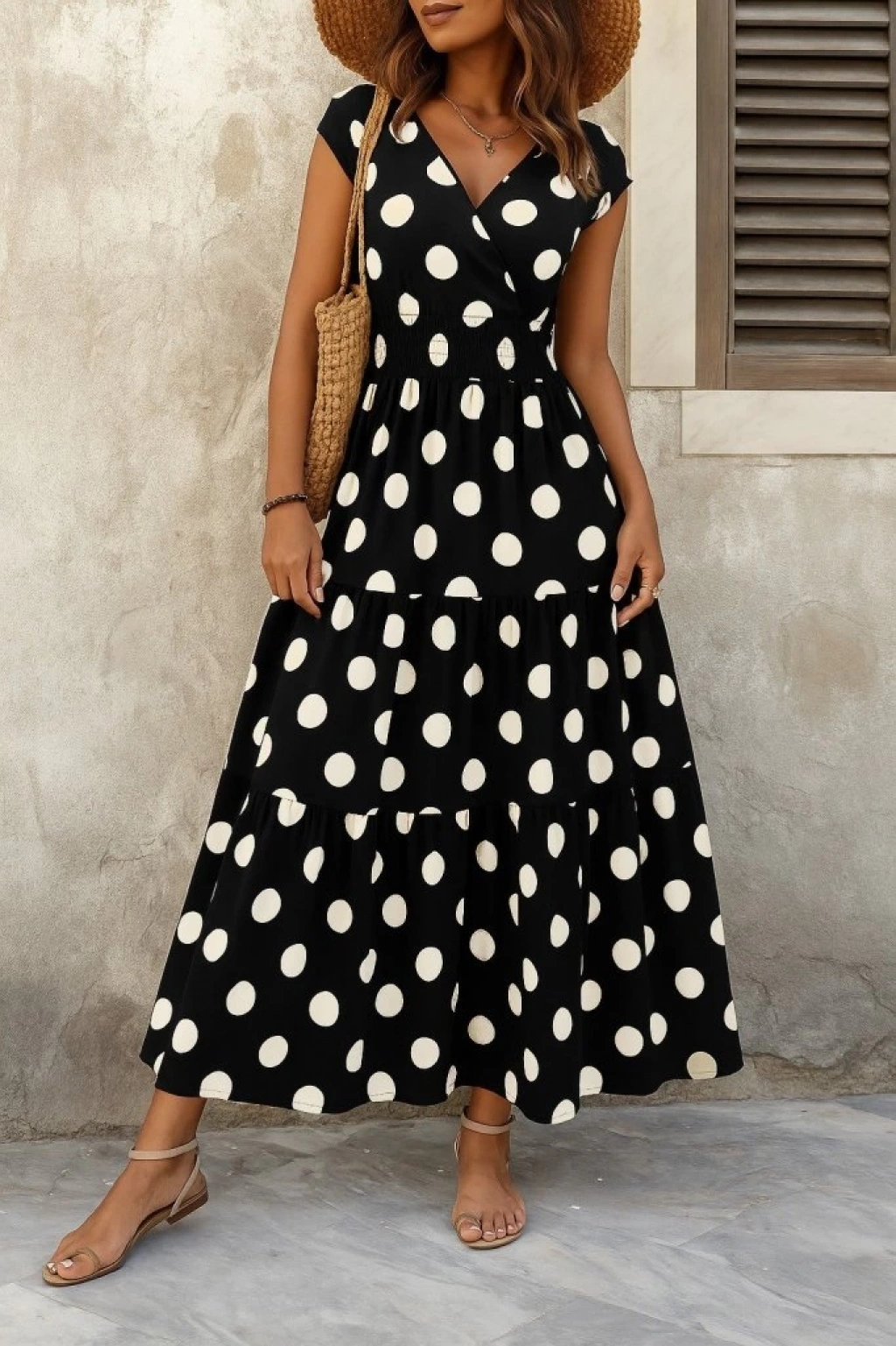 Kadın Kısa Kollu Kruvaze Yaka Beli Lastikli Süprem Maksi Boy Elbise