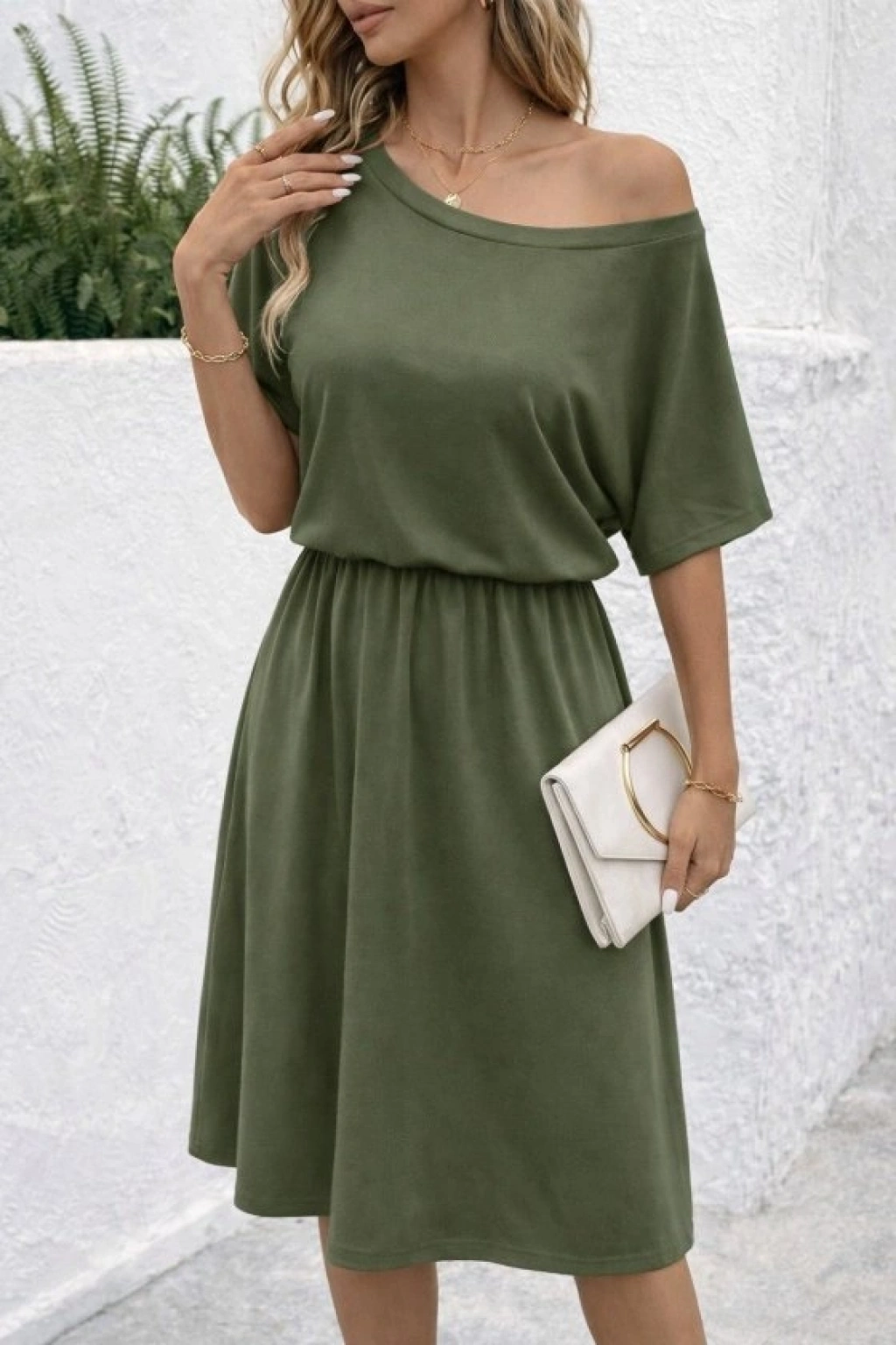 Kadın Kısa Kollu Omuzdan Açık Kiloş Midi Viskon Elbise