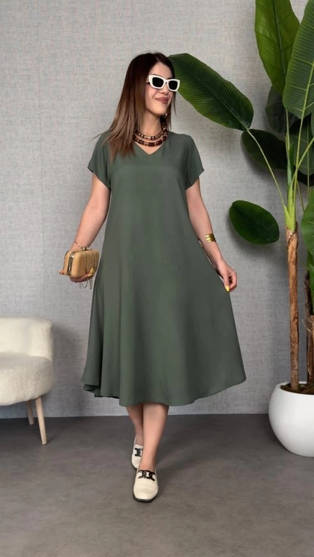 Kadın Kısa Kollu V Yaka Salaş Maxi Boy Elbise