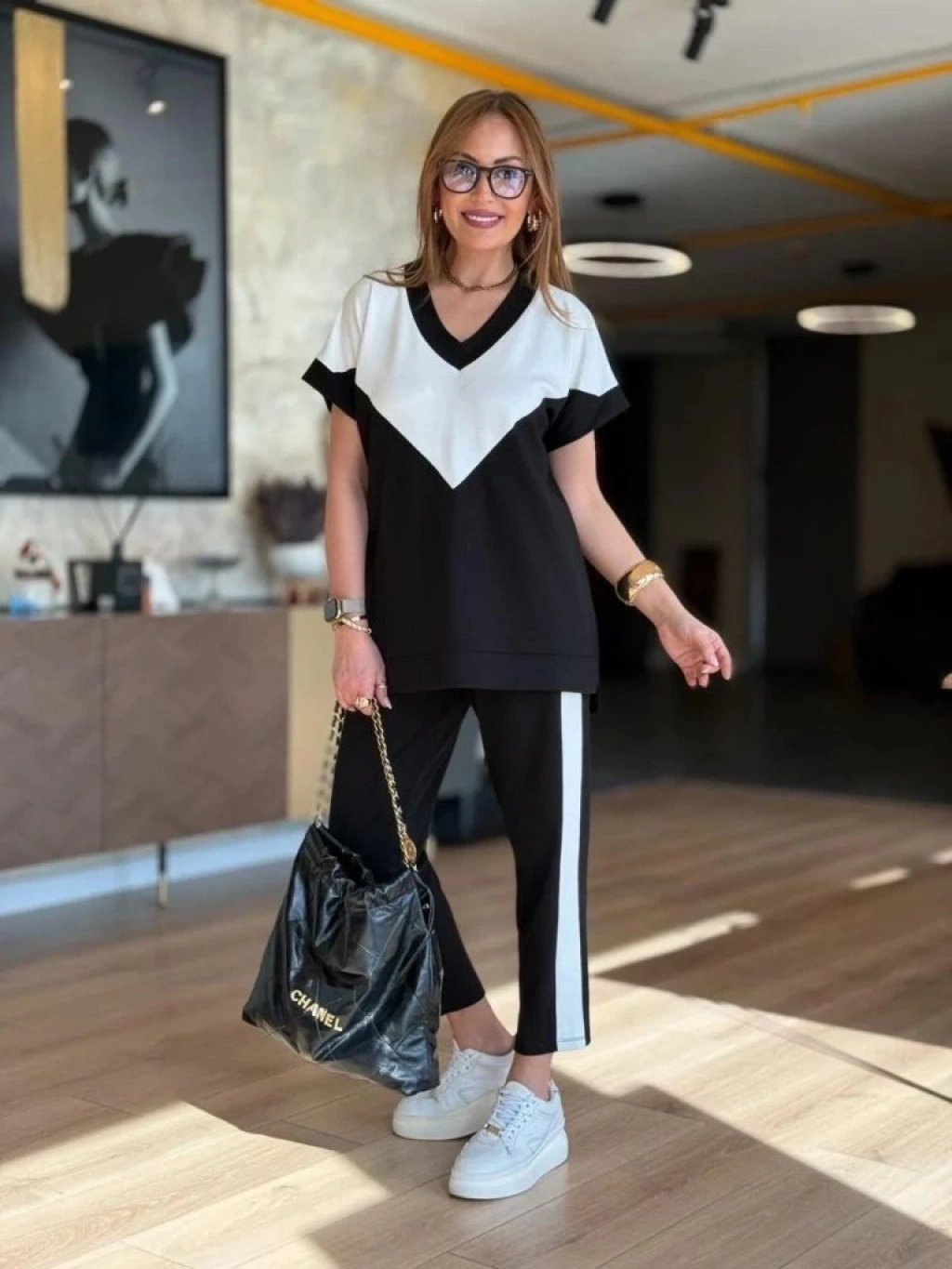 Kadın Kısa Kollu V Yaka Siyah Beyaz Renkli Viskon Iki Iplik Kumaş Eşofman Takımı