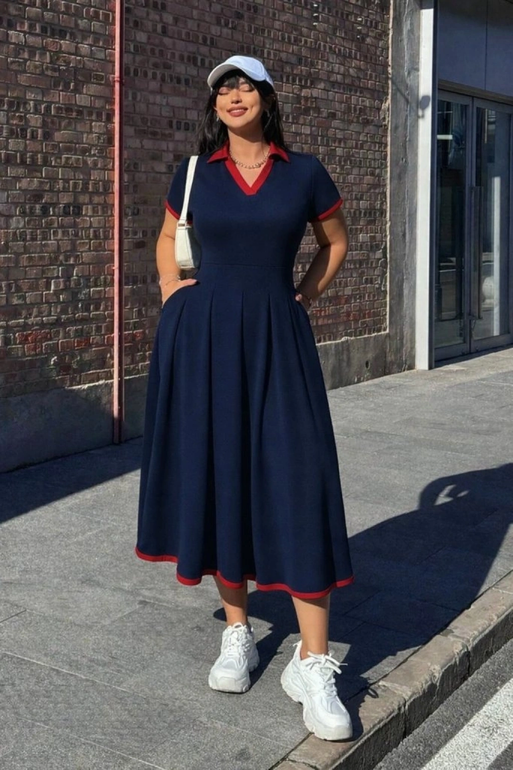 Kadın Kısa Kollu V Yakalı Pileli Uzun Janjan Krep Elbise