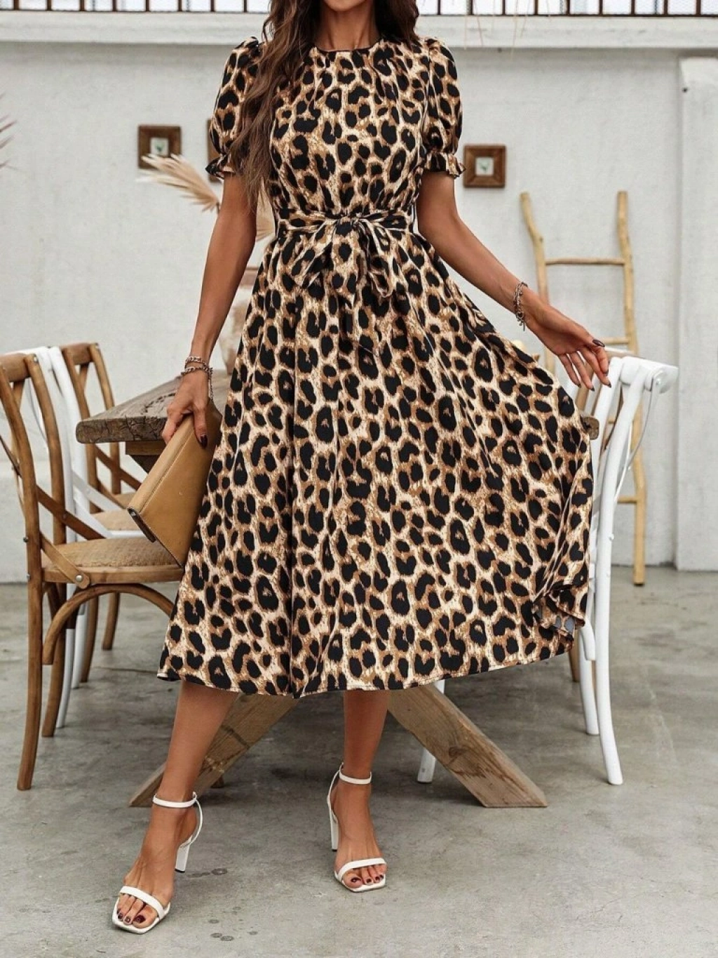 Kadın Kısa Kollu Yakalı Belden Kuşaklı Leopar Desenli Midi Süprem Elbise