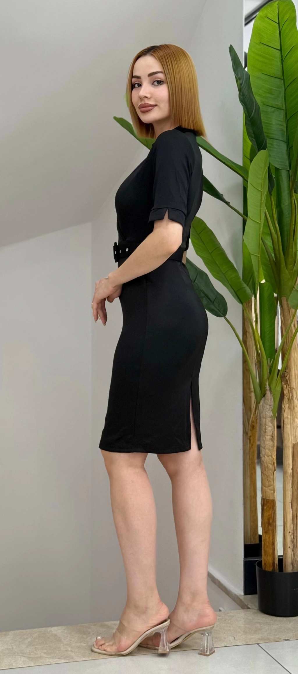 Kadın Kısa Kollu Yakalı Kruvaze Yakalı Beli Kemerli Midi Modal Elbise