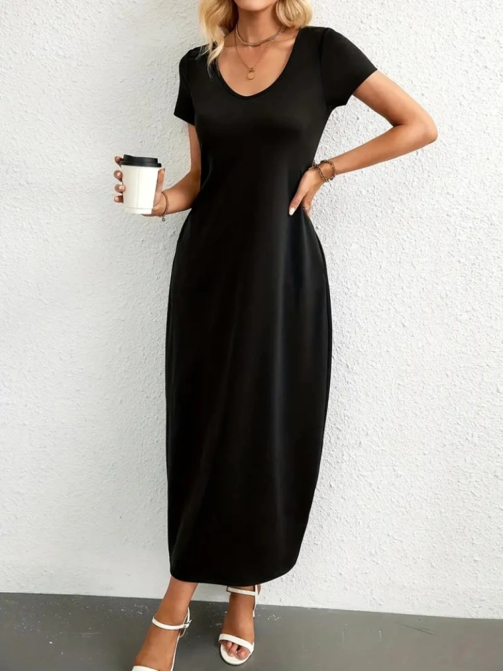 Kadın Kısa Kollu Yakası Yuvarlak Cepli Viskon Elbise