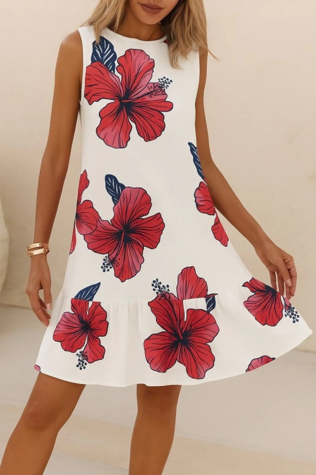 Kadın Sıfır Kol Sırttan Bağlamalı Fırfırlı çiçek Desenli Süprem Elbise