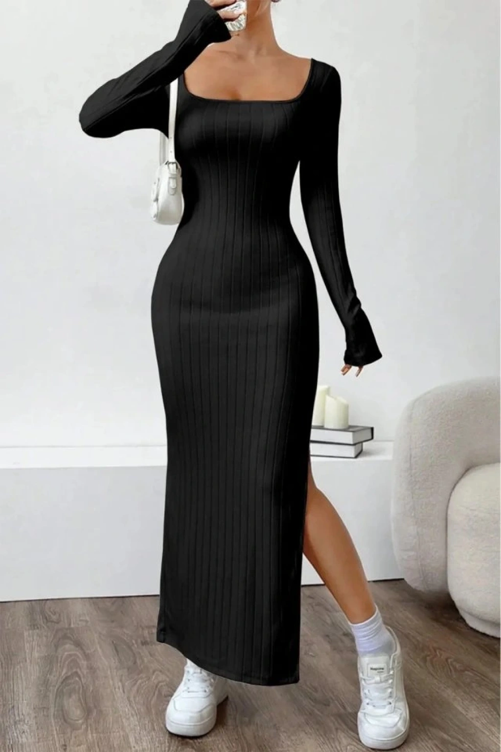 Kadın Trend U Yaka Yırtmaçlı Uzun Kol Kalın Fitili Elbise