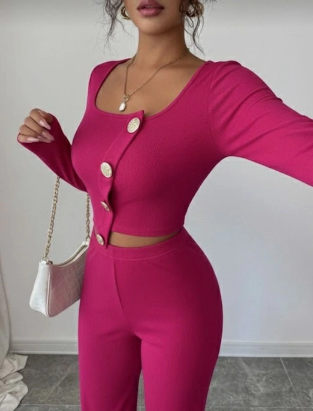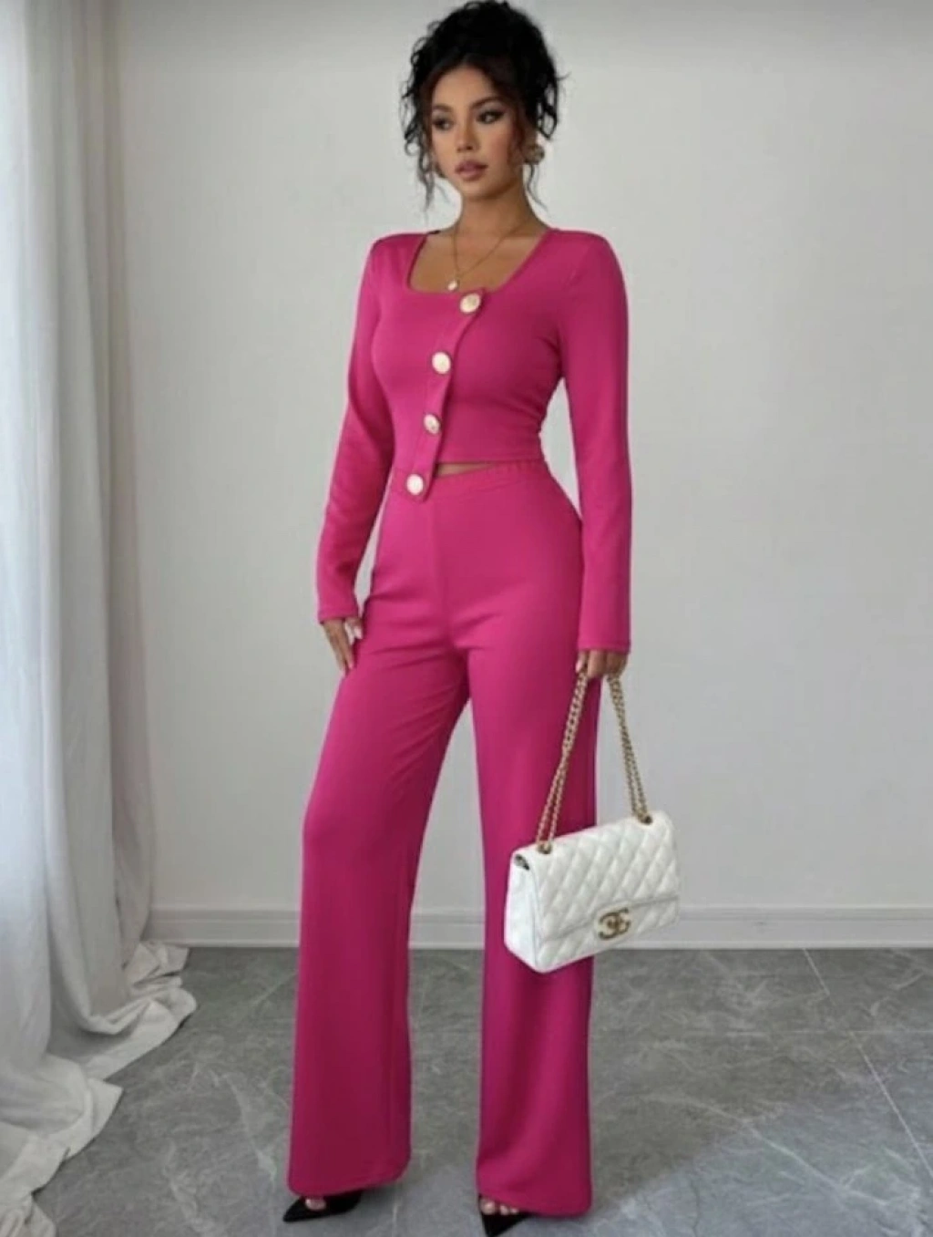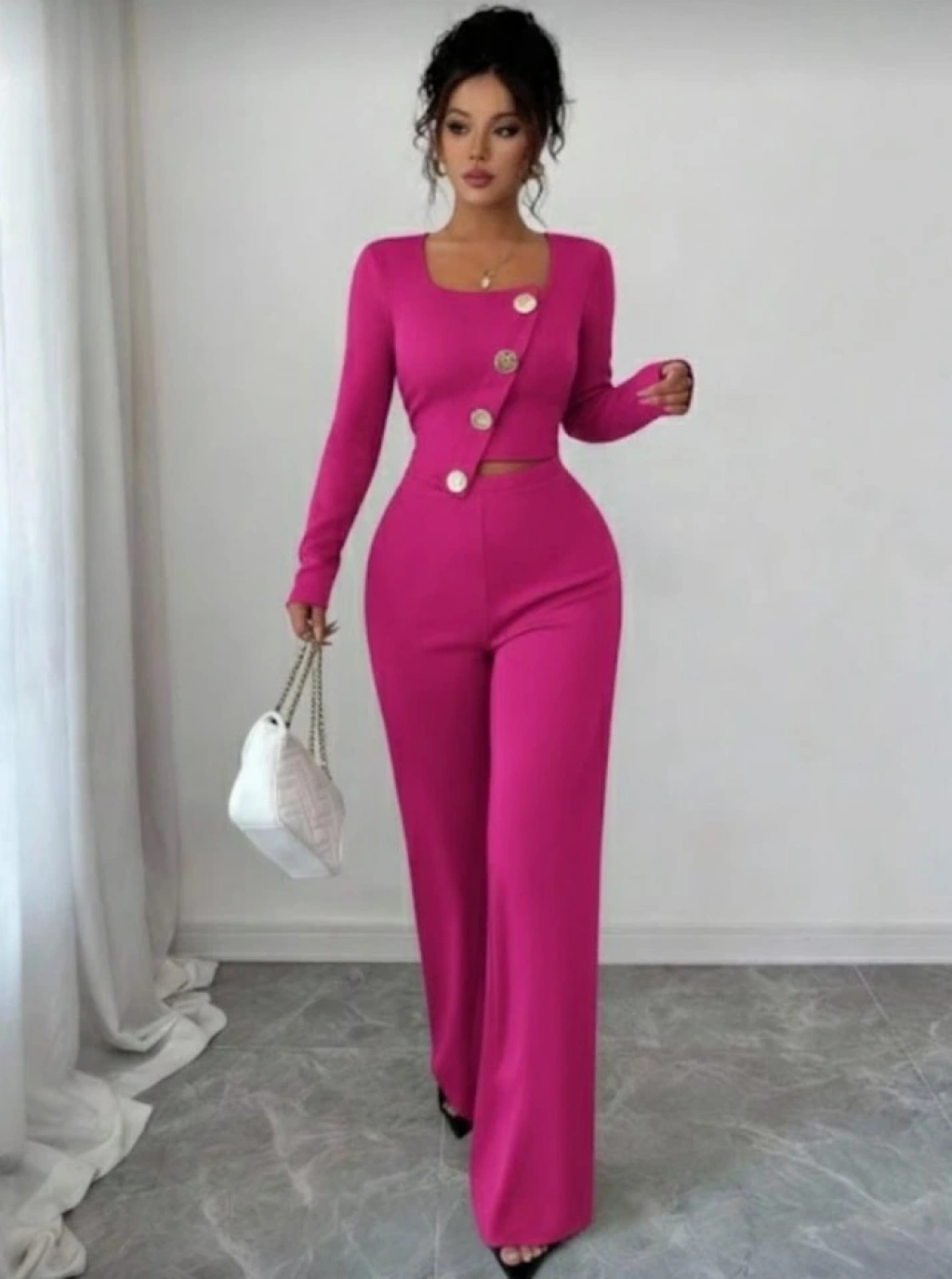 Kadın Uzun Kol Kare Yaka Asimetrik Düğme Detay Bluz Ve Yüksek Bel Pantolon Ikili Takım