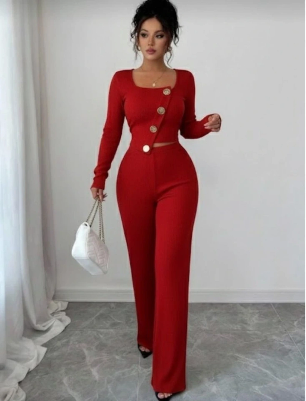 Kadın Uzun Kol Kare Yaka Asimetrik Düğme Detay Bluz Ve Yüksek Bel Pantolon Ikili Takım