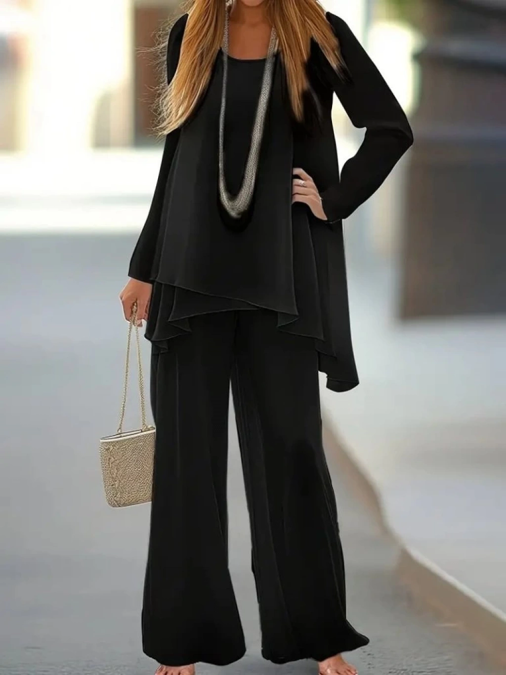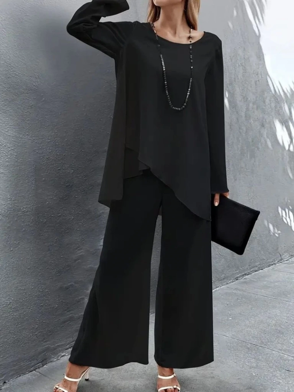Kadın Uzun Kollu Asimetrik Detaylı Salaş Sandy Bluz Ve Pantolon Ikili Takım