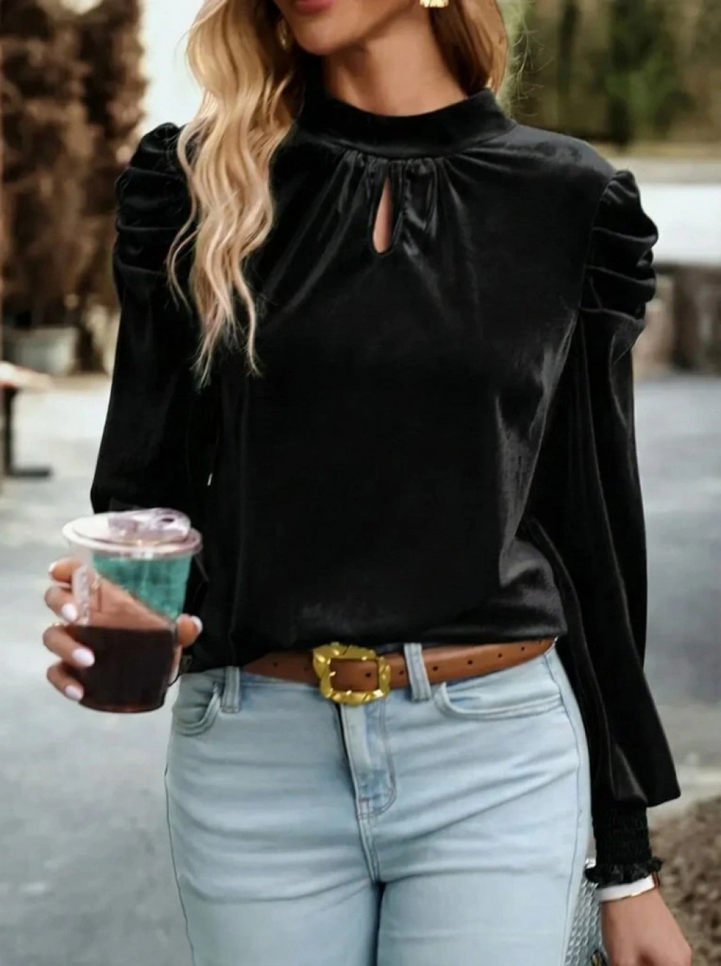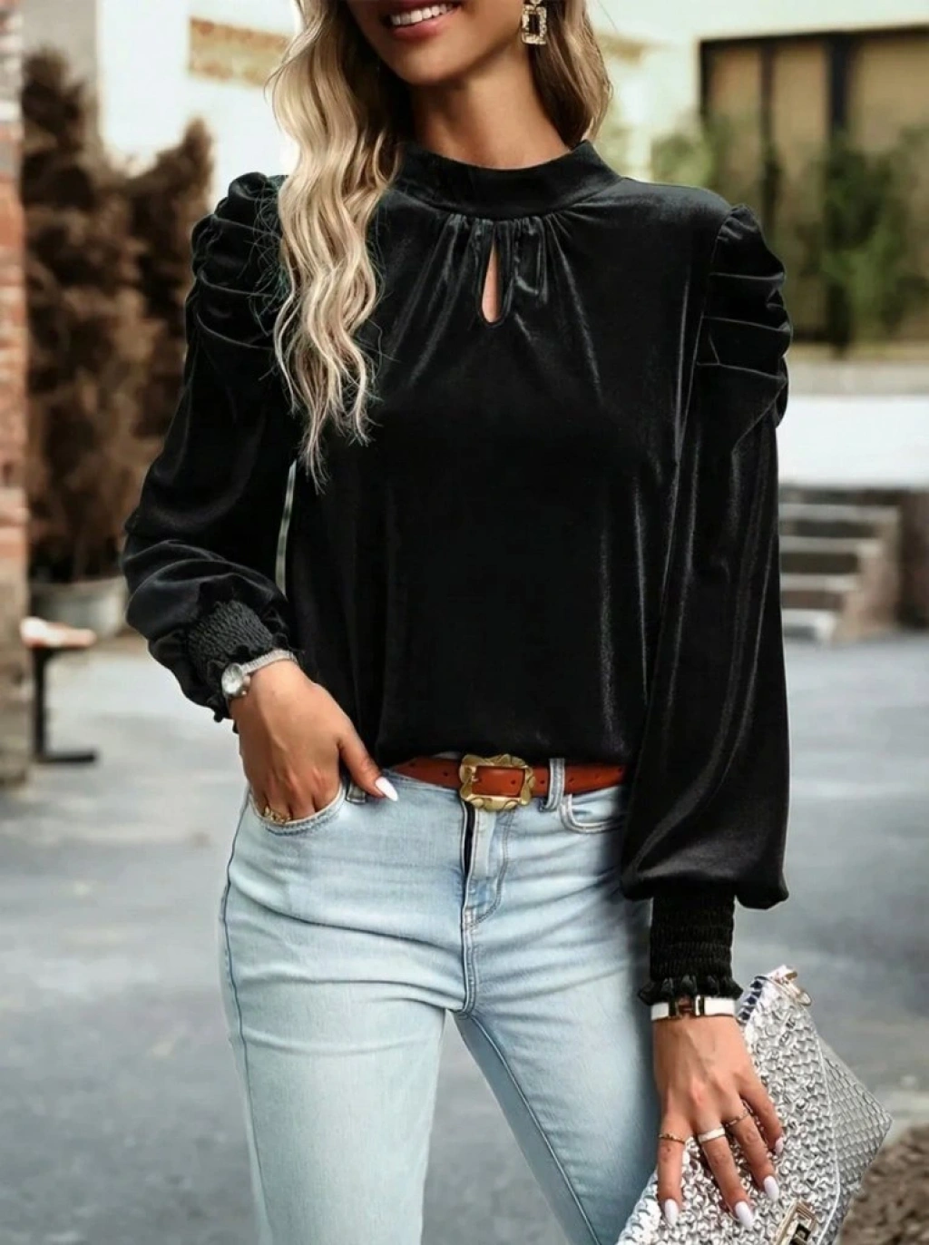 Kadın Uzun Kollu Balıkçı Yaka Damla Detaylı Kadife Bluz