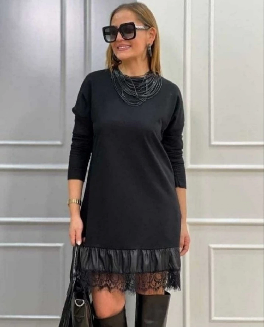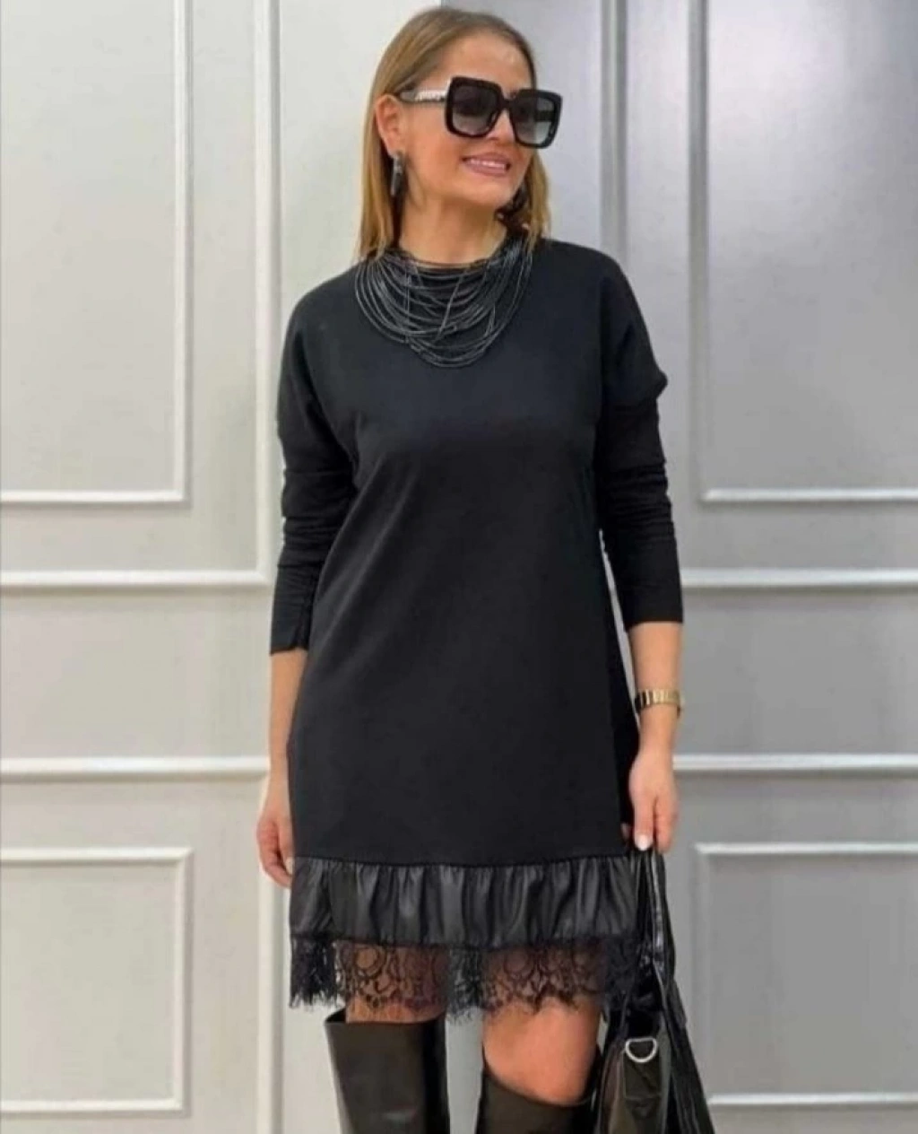 Kadın Uzun Kollu Bisiklet Yaka Etek Ucu Deri Dantelli Viskon Iki Iplik Midi Elbise