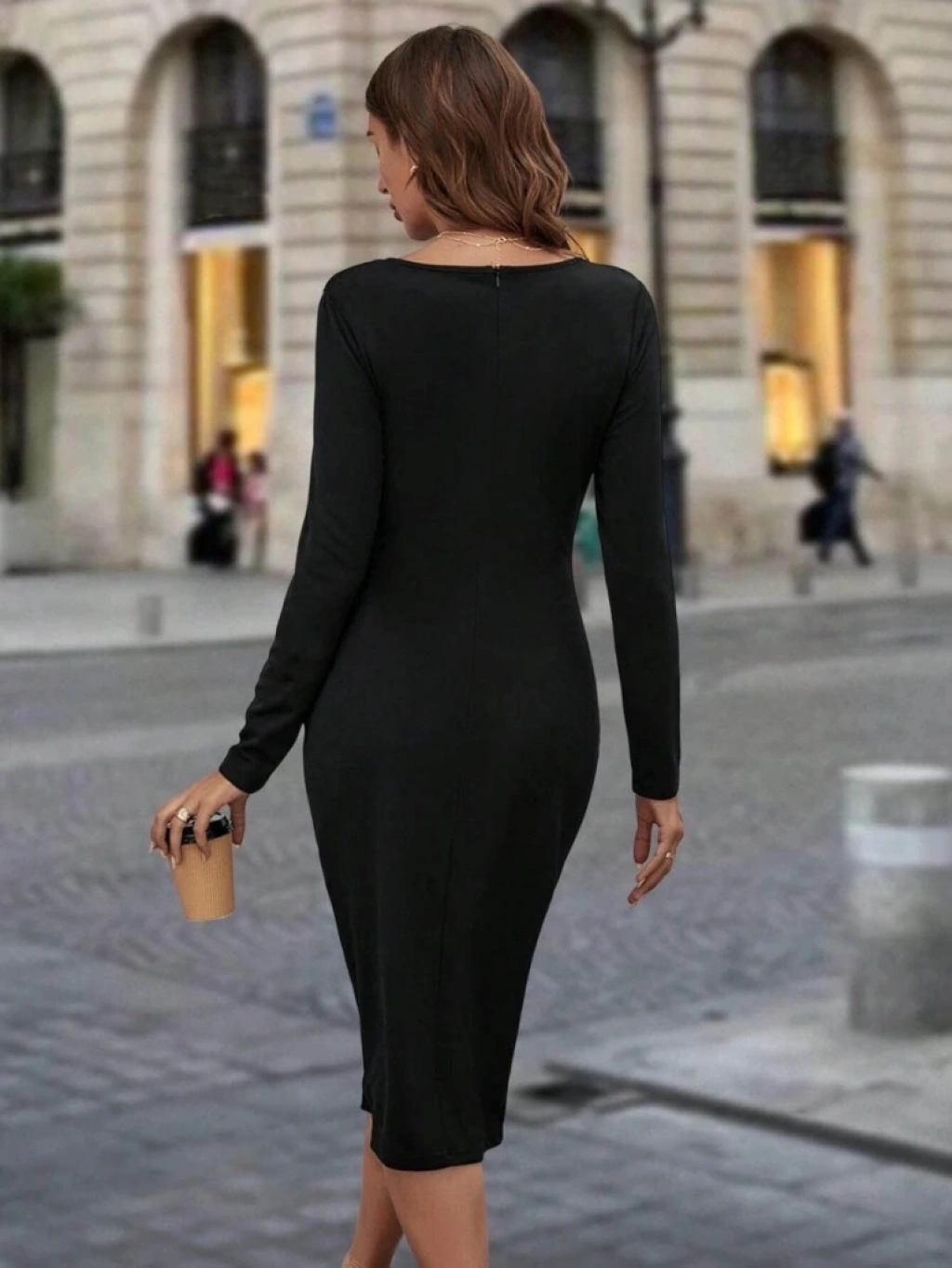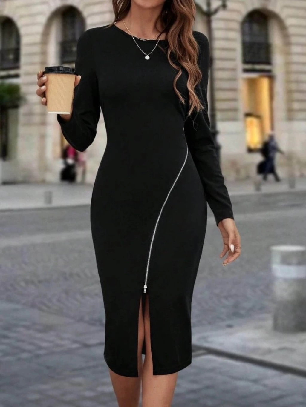 Kadın Uzun Kollu Bisiklet Yaka Fermuar Detaylı Yırtmaçlı Midi Krep Elbise