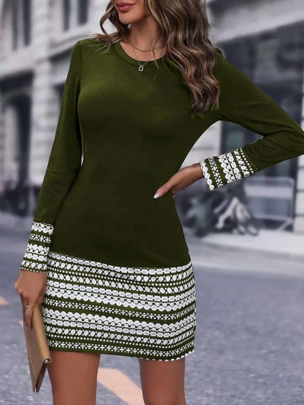 Kadın Uzun Kollu Bisiklet Yaka Kol Ağzı Ve Etek Ucu Baskılı Iki Iplik Elbise