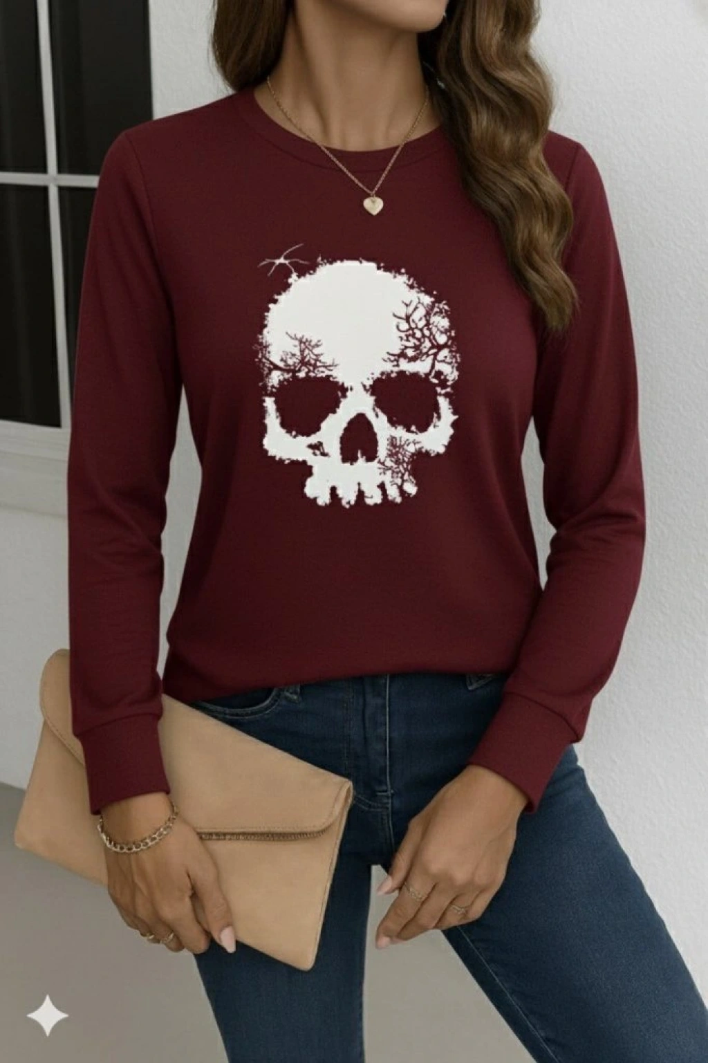 Kadın Uzun Kollu Bisiklet Yaka Kurukafa Desenli Viskon Bluz