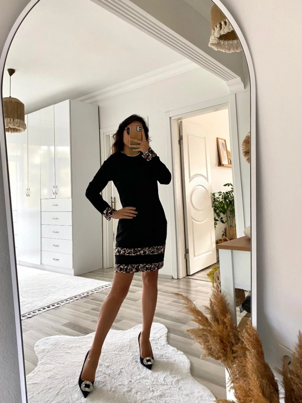 Kadın Uzun Kollu Bisiklet Yaka şerit Leopar Desenli Kısa Dalgıç Elbise