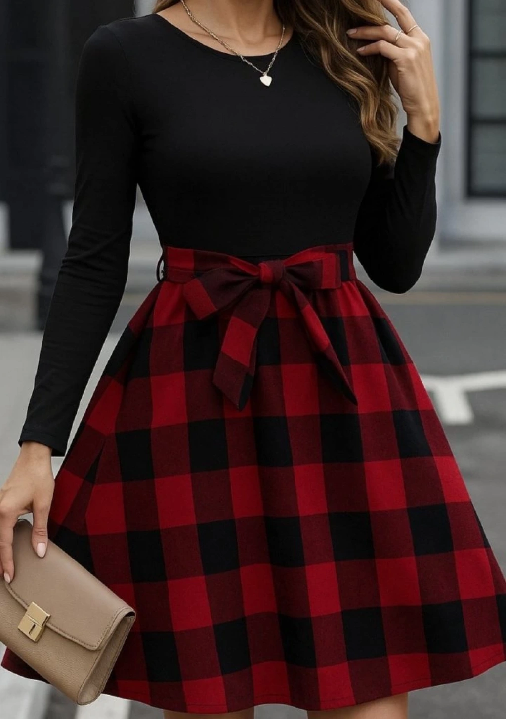 Kadın Uzun Kollu Bisiklet Yaka üst Viskon Alt Ekose Kısa Elbise