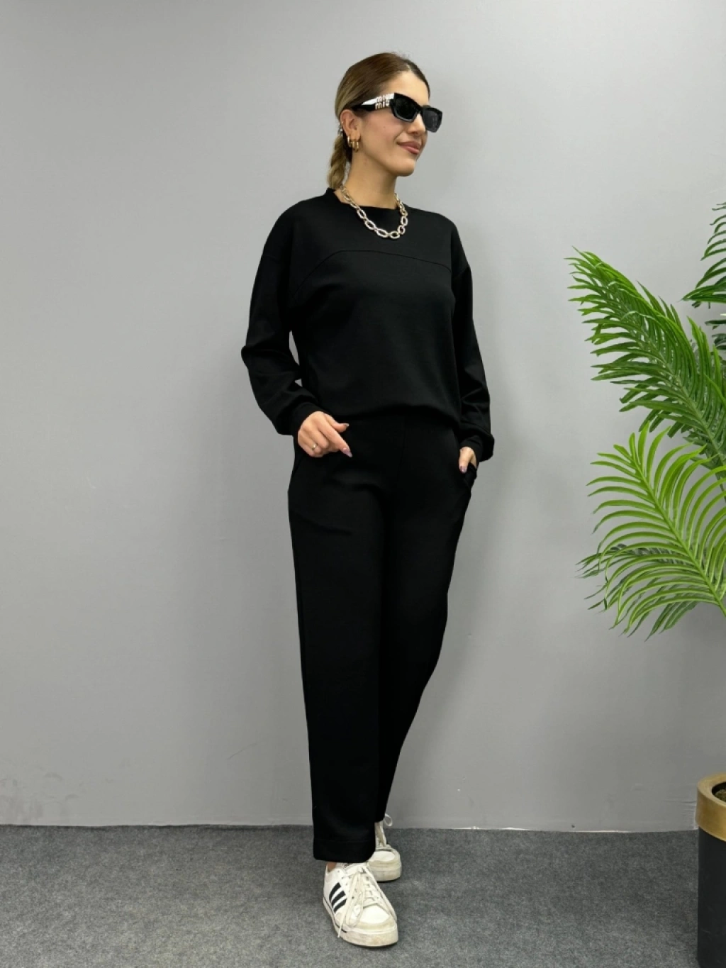 Kadın Uzun Kollu Bisiklet Yaka Viskon Iki Iplik Bluz Ve Pantolon Ikili Takım