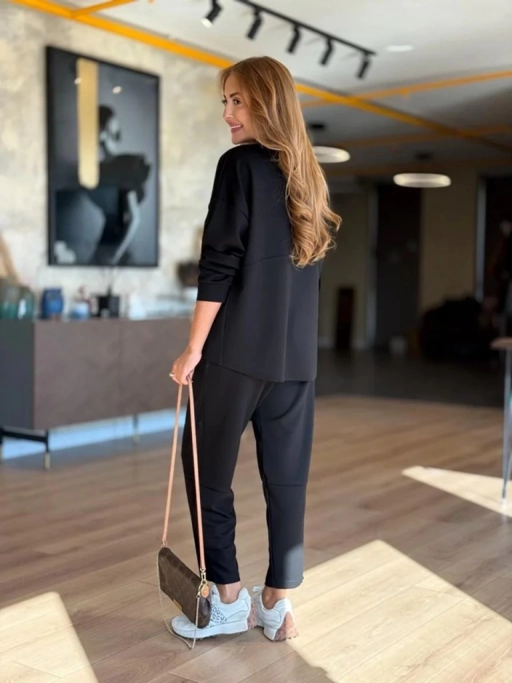 Kadın Uzun Kollu Bisiklet Yaka Viskon Iki Iplik Bluz Ve Pantolon Ikili Takım