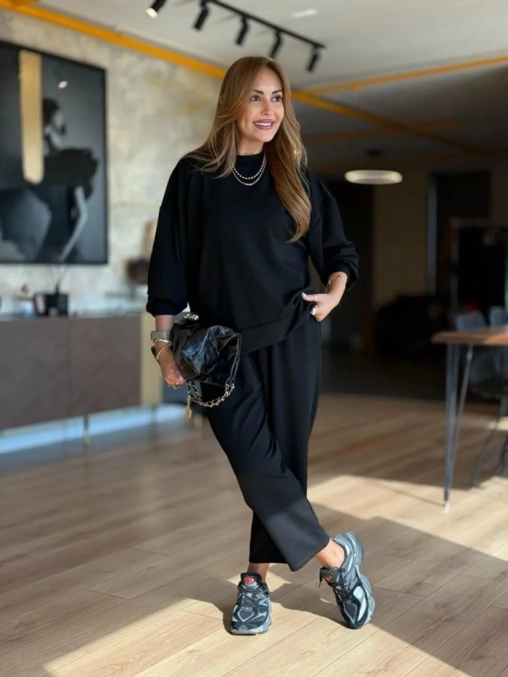 Kadın Uzun Kollu Bisiklet Yaka Viskon Iki Iplik Bluz Ve Pantolon Ikili Takım