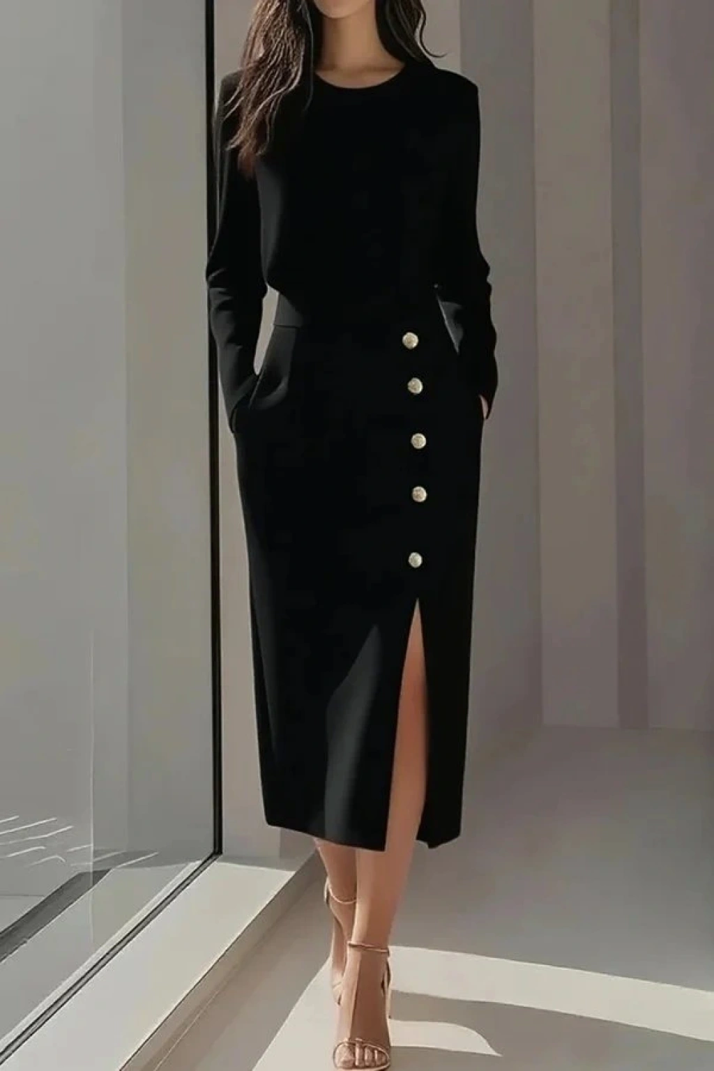 Kadın Uzun Kollu Bisiklet Yakalı Yandan Yırtmaçlı Düğmeli Midi Ithal Krep Elbise