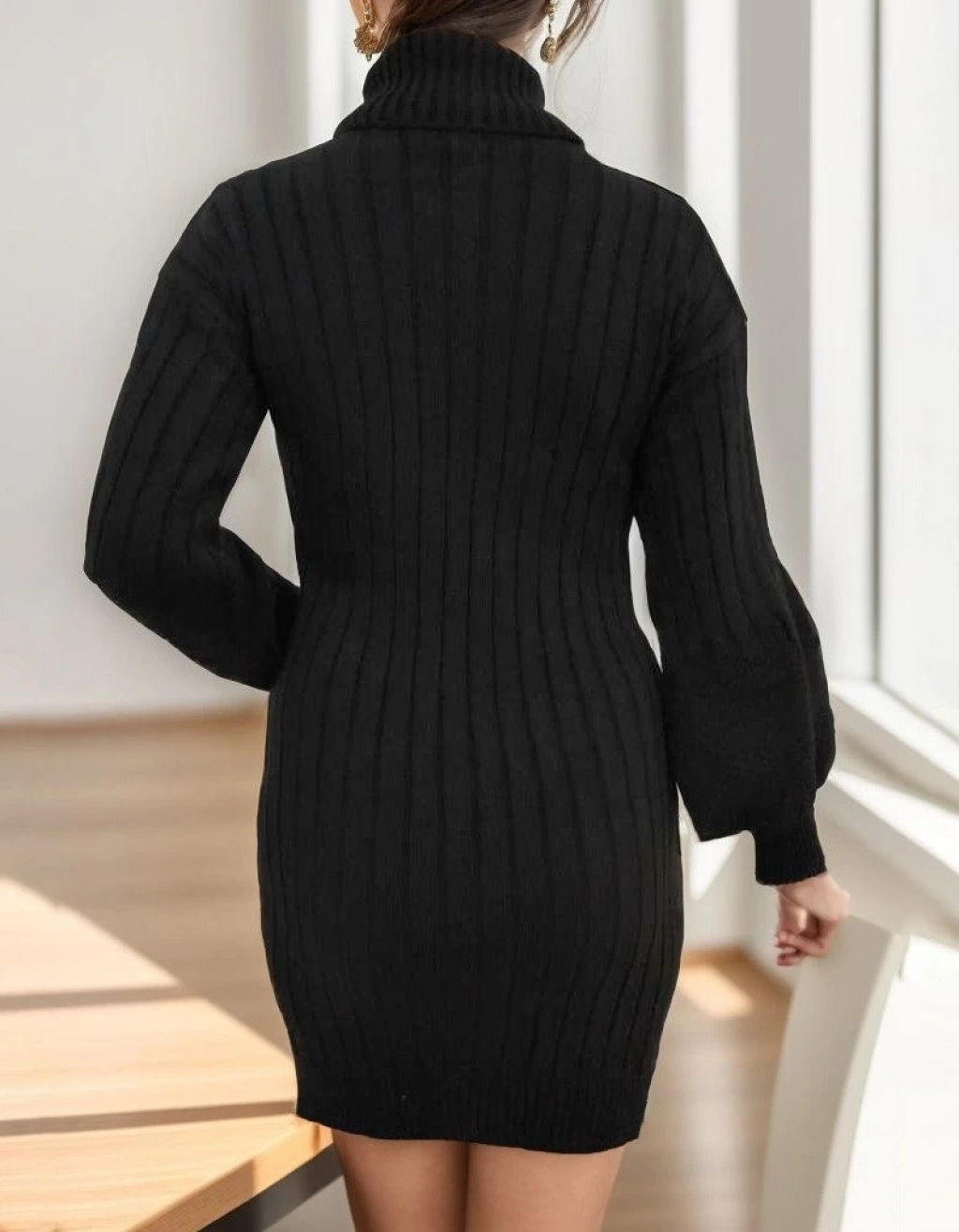 Kadın Uzun Kollu Boğazlı Uzun Balon Kol Triko Mini Elbise