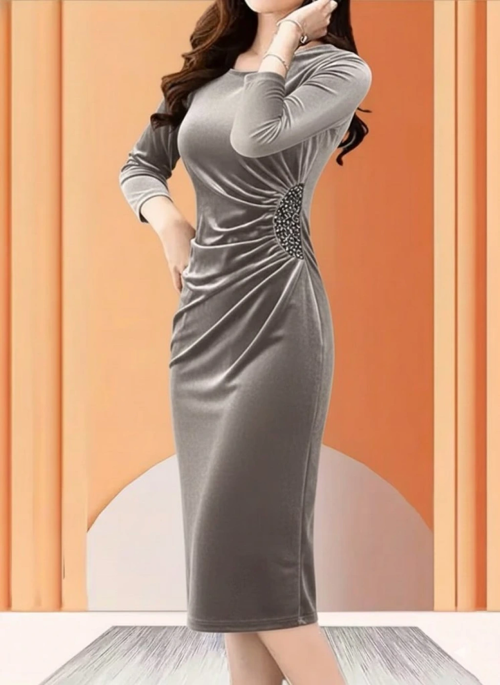 Kadın Uzun Kollu Bot Yaka Yanı Taş Detaylı Midi Kadife Elbise