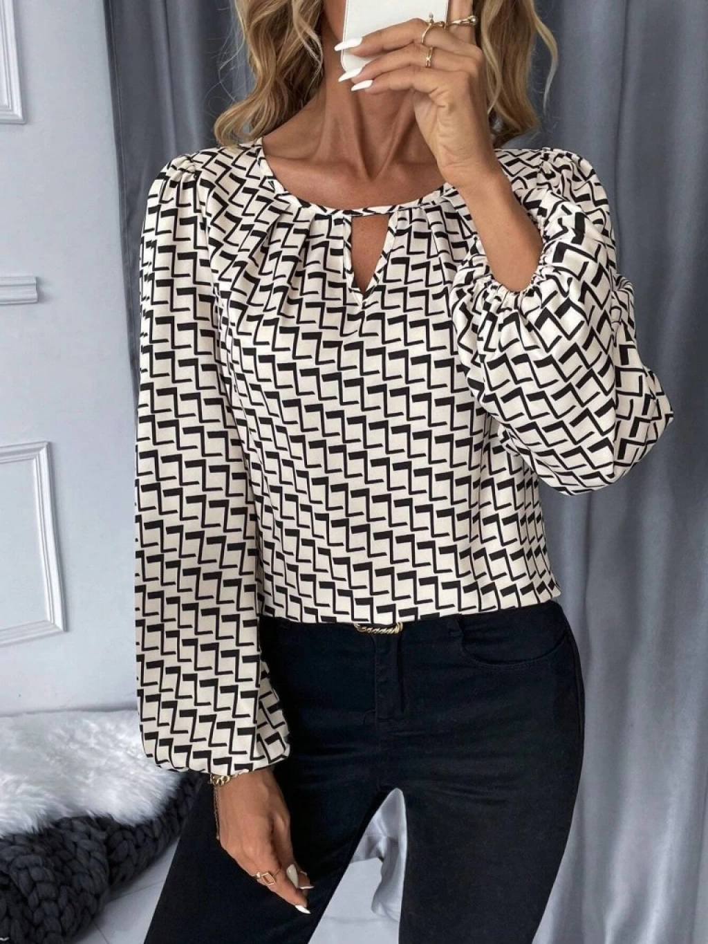 Kadın Uzun Kollu Damla Detaylı Yaka Desenli Süprem Bluz