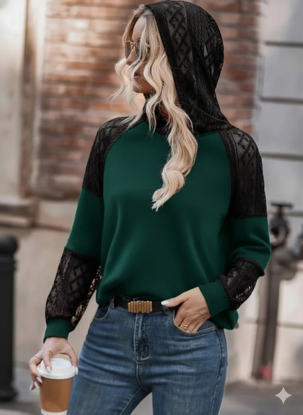Kadın Uzun Kollu Dantelli Kapşonlu Viskon Iki Iplik Bluz
