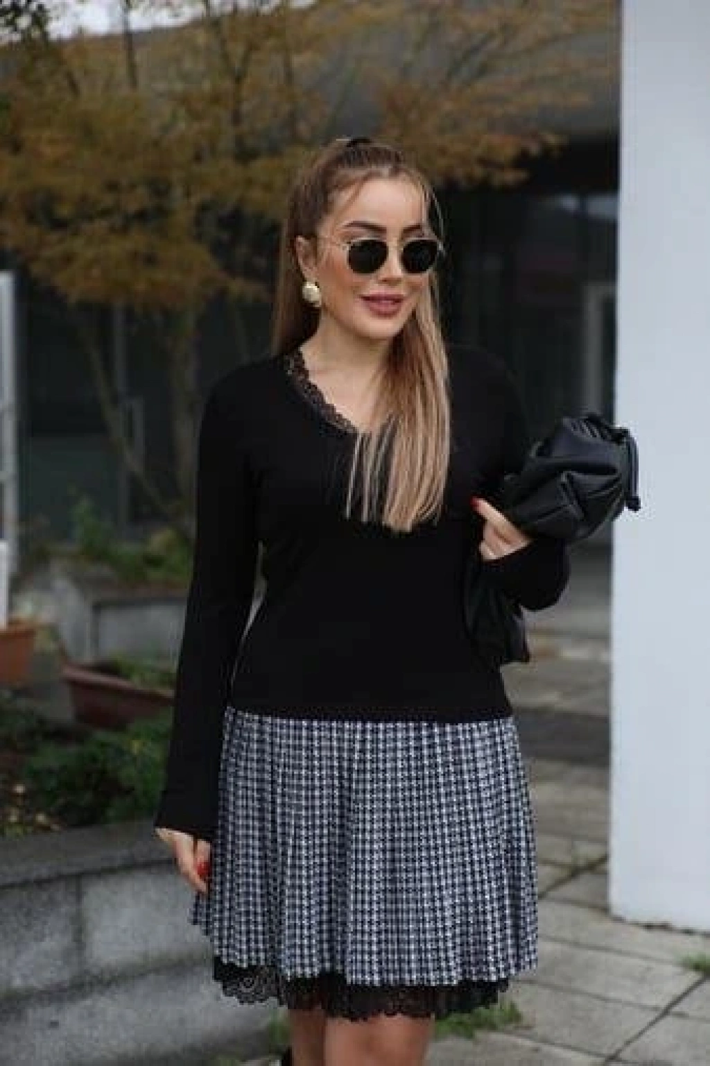 Kadın Uzun Kollu Denteli Yaka Ekose Etek Detay Diz üstü Elbise