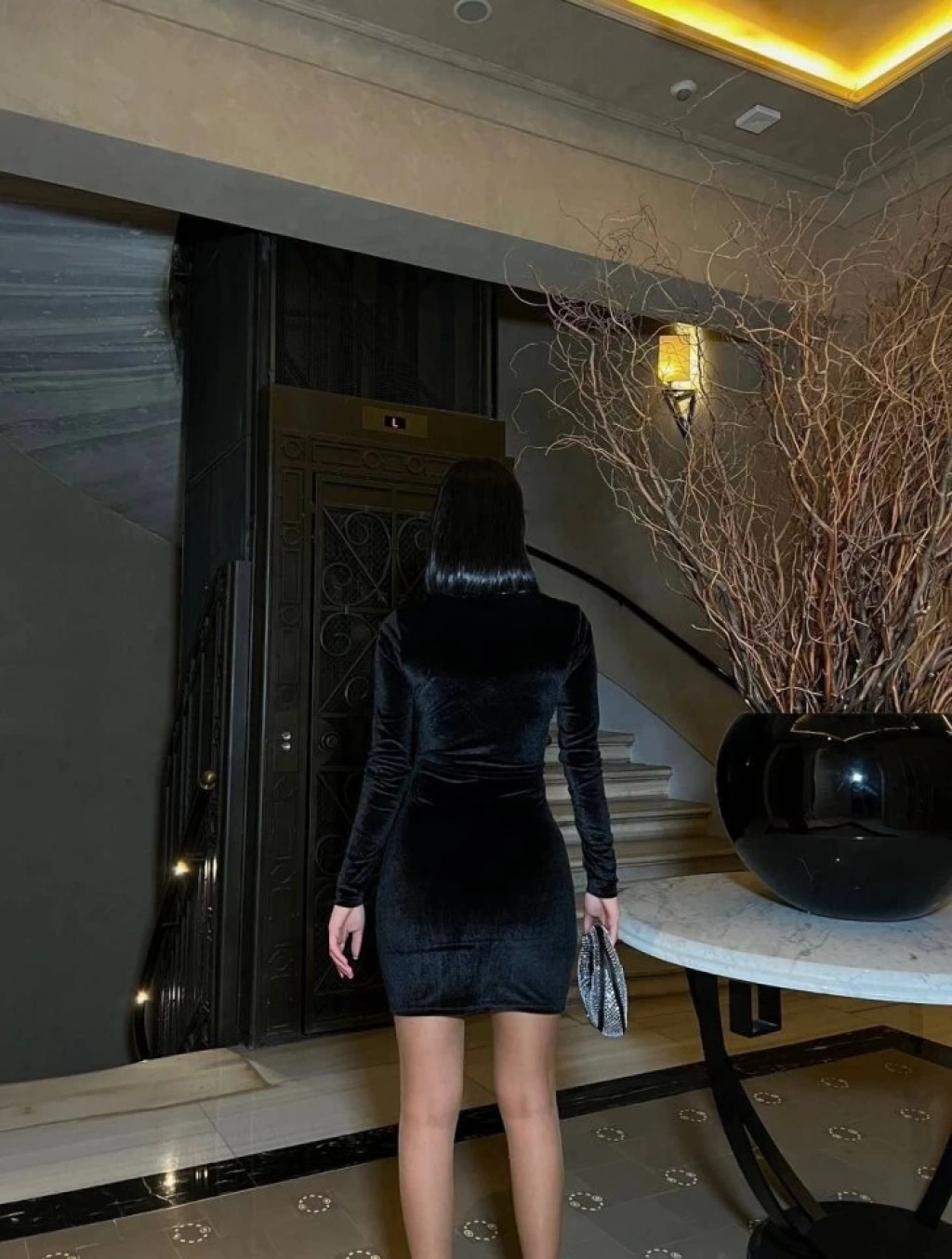 Kadın Uzun Kollu Göğüs Dekolteli Kadife Kumaş Mini Kruvaze Elbise
