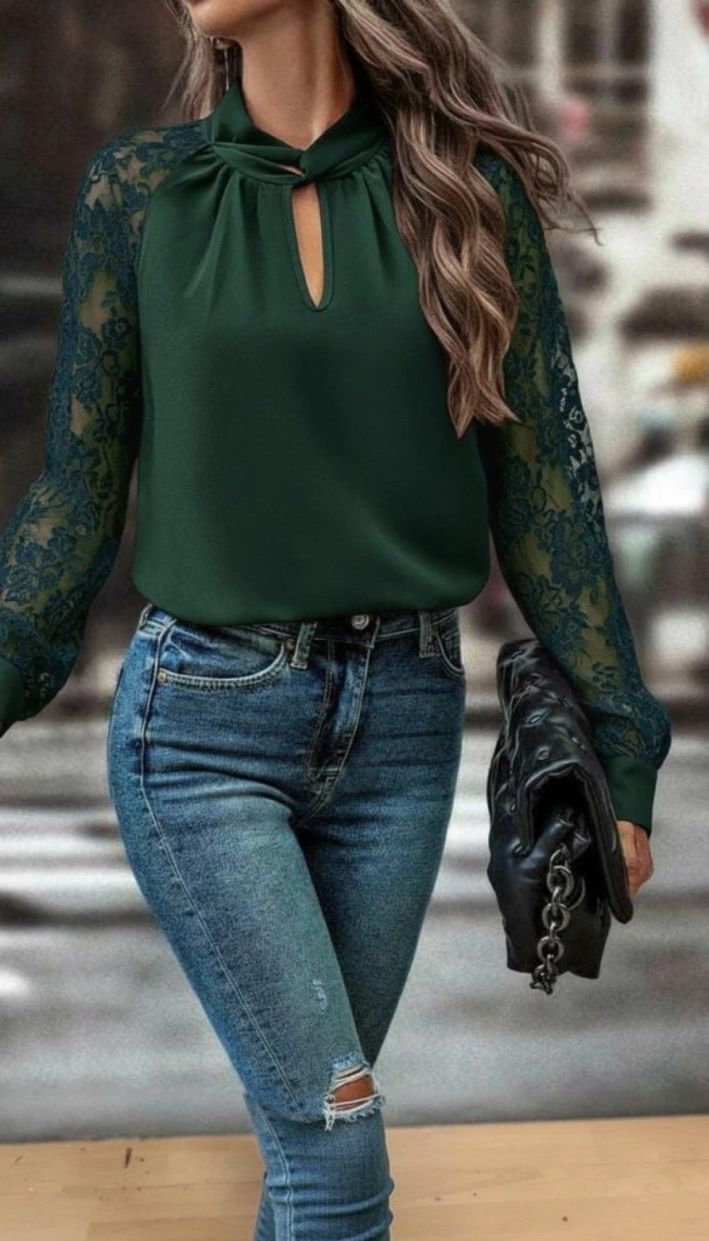 Kadın Uzun Kollu Göğüs Pencere Detay Yaka Boğazlı Kolları Tüllü Sandy Bluz
