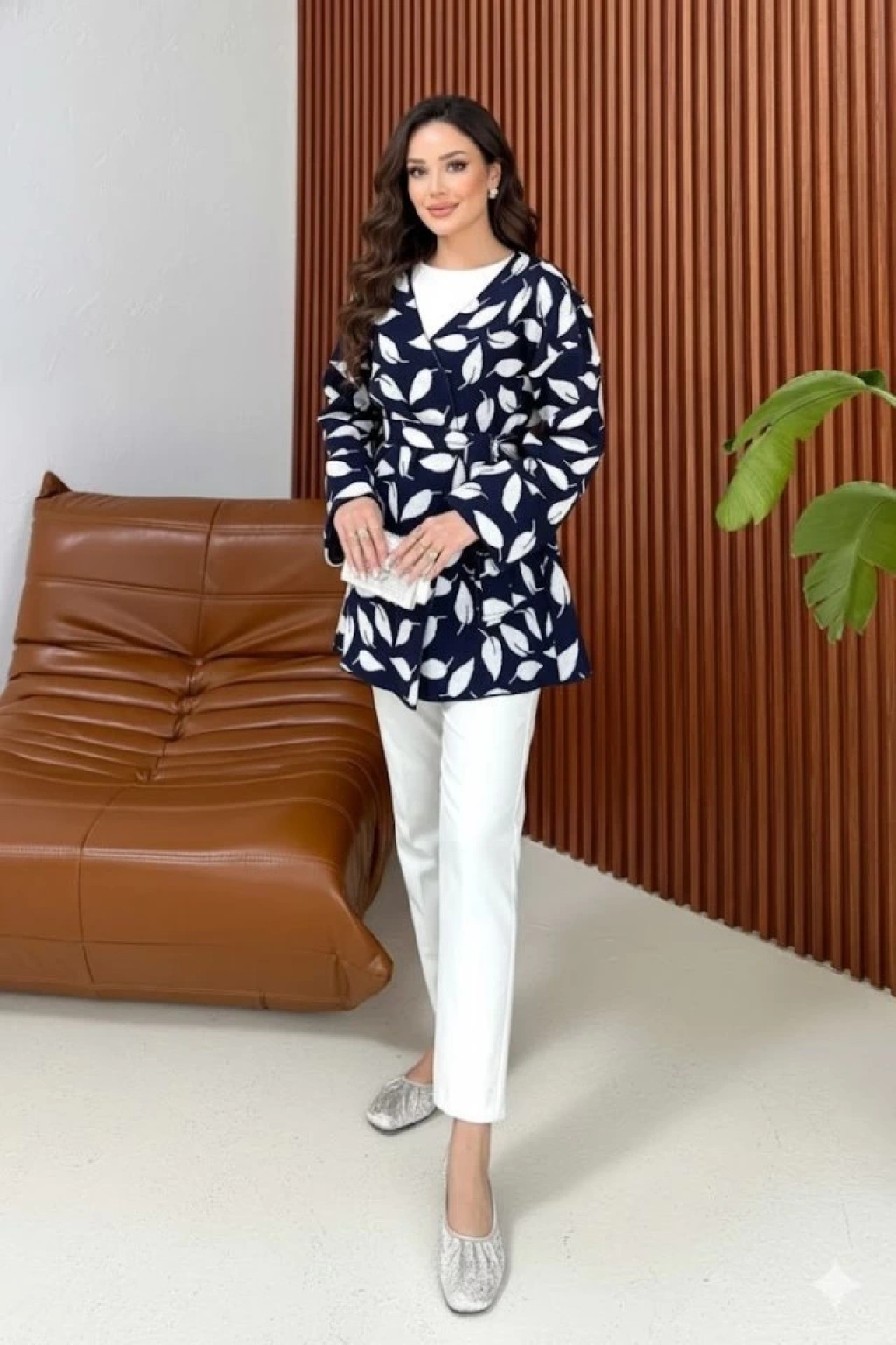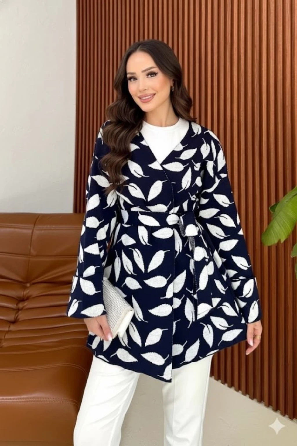 Kadın Uzun Kollu Kadın Uzun Kollu Yaprak Desen Kuşak Dahil Hırka