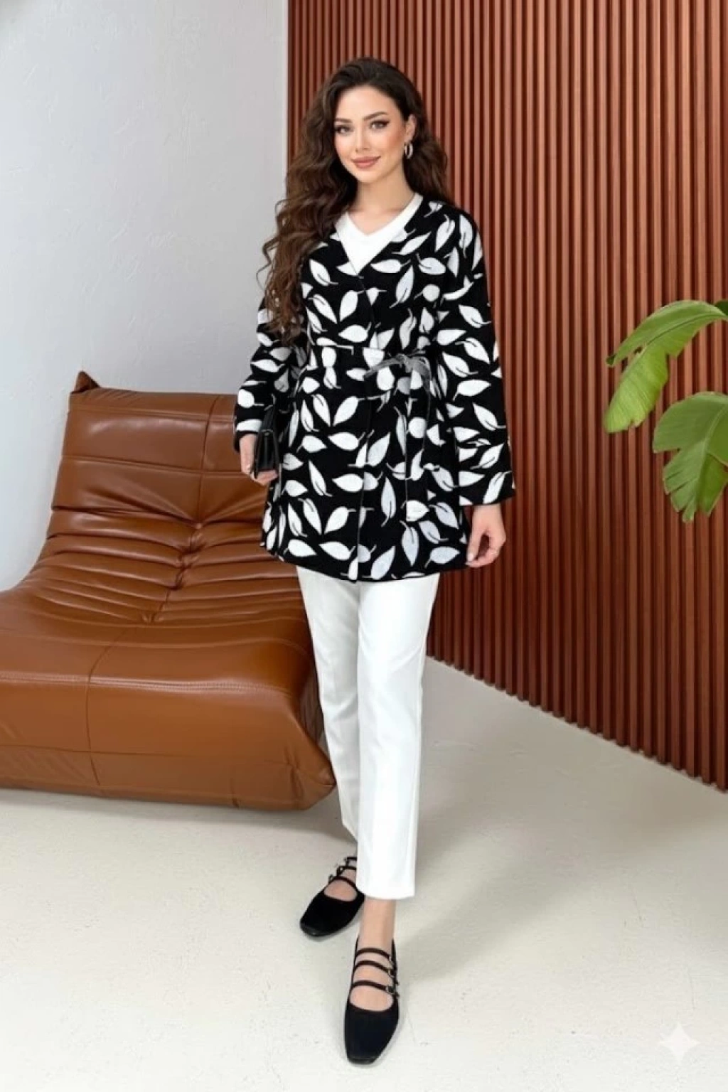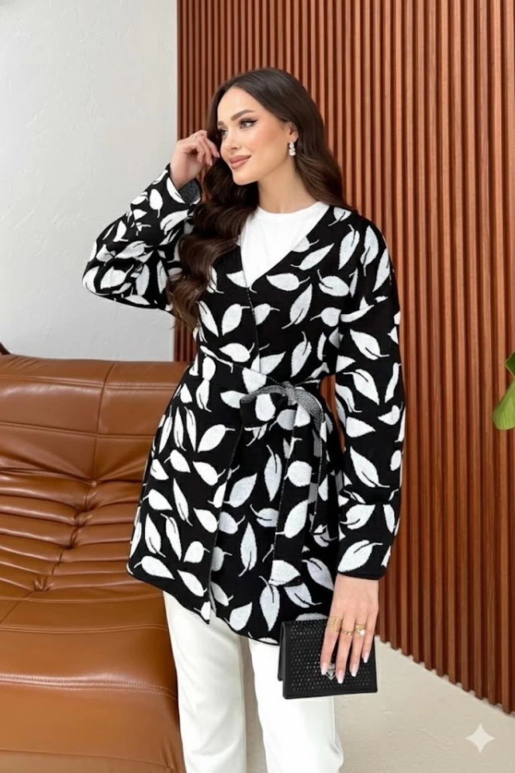 Kadın Uzun Kollu Kadın Uzun Kollu Yaprak Desen Kuşak Dahil Hırka