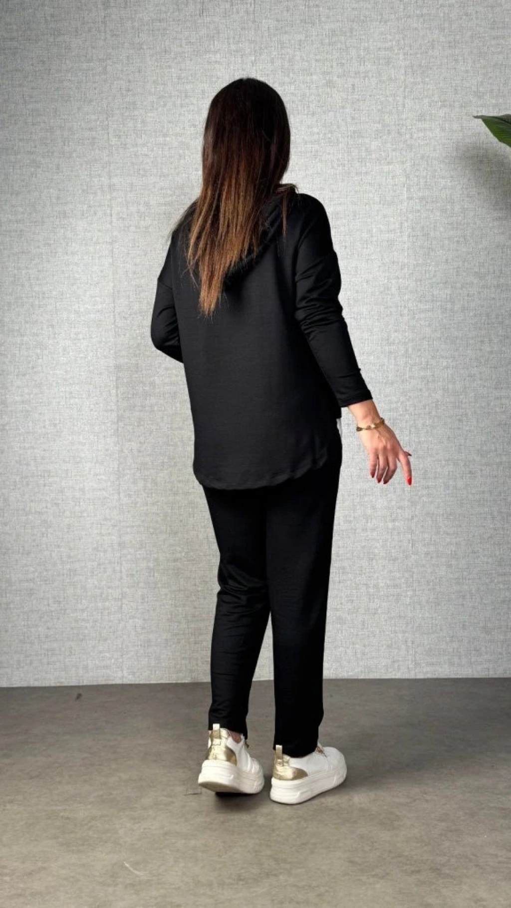 Kadın Uzun Kollu Kapşonlu Bağcıklı Viskon Iki Iplik Bluz Ve Pantolon Ikili Takım