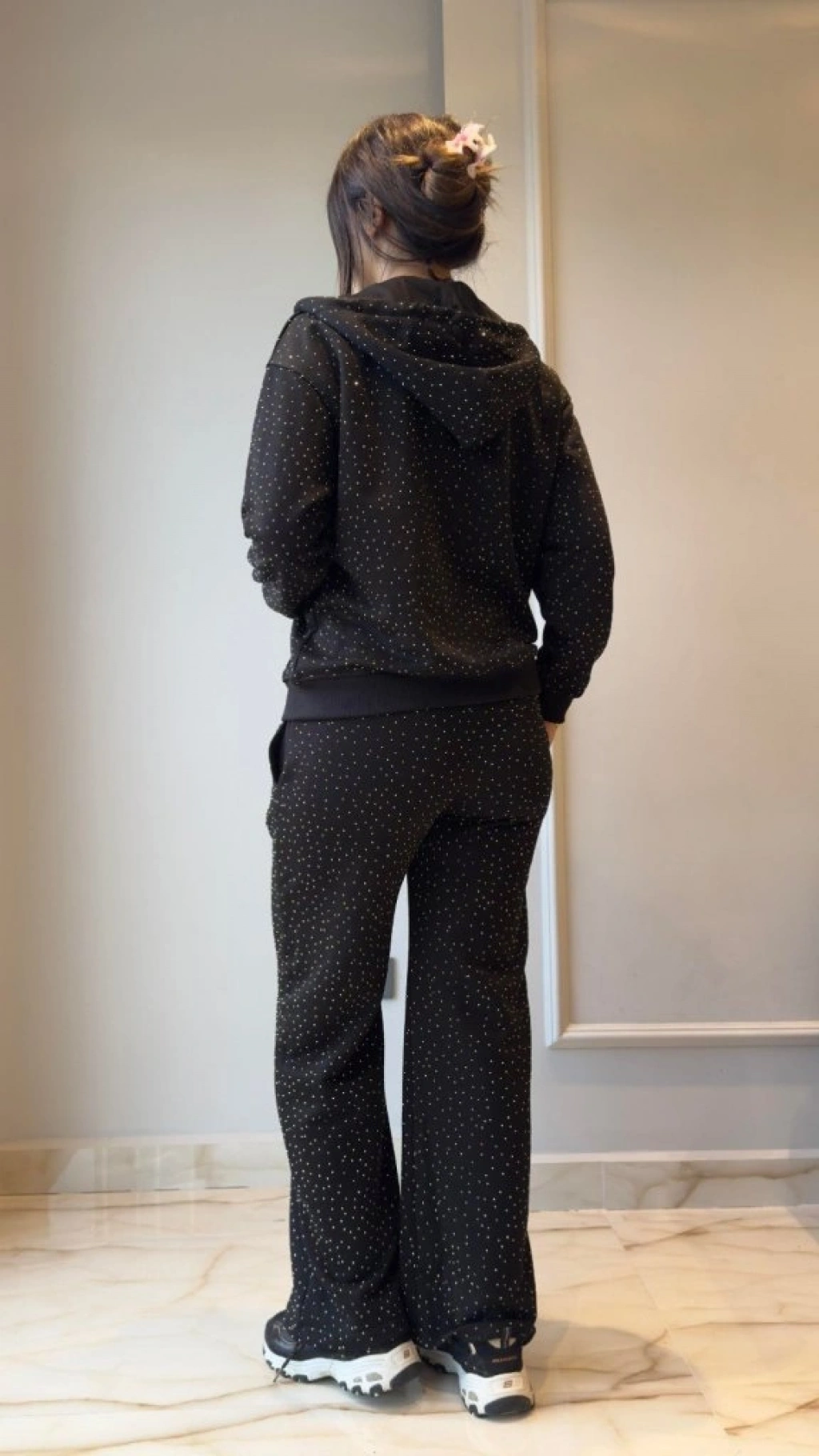 Kadın Uzun Kollu Kapşonlu Fermuarlı Taşlı önü Fermuarlı Viskon Iki Iplik Bluz Ve Eşofman Altı Ikili Takım