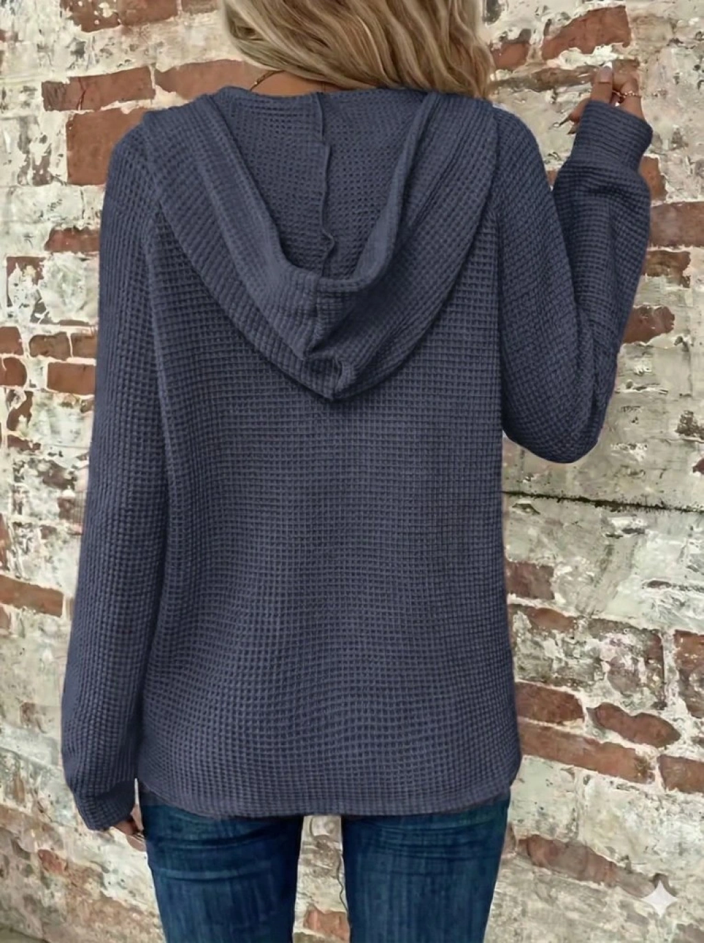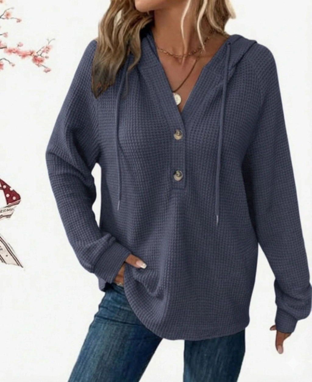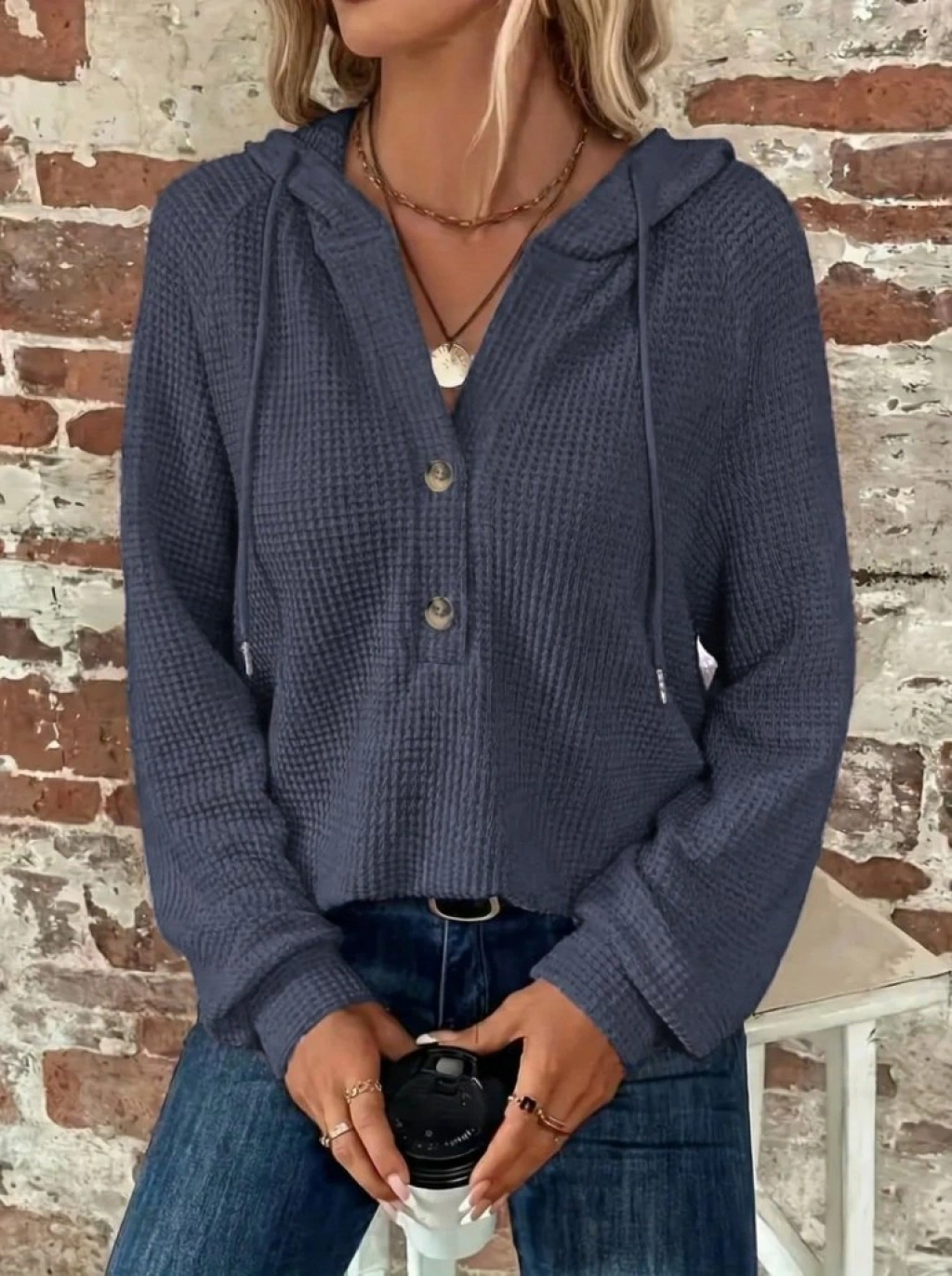 Kadın Uzun Kollu Kapşonlu önü Düğmeli Ve Bağcıklı Waffle Bluz