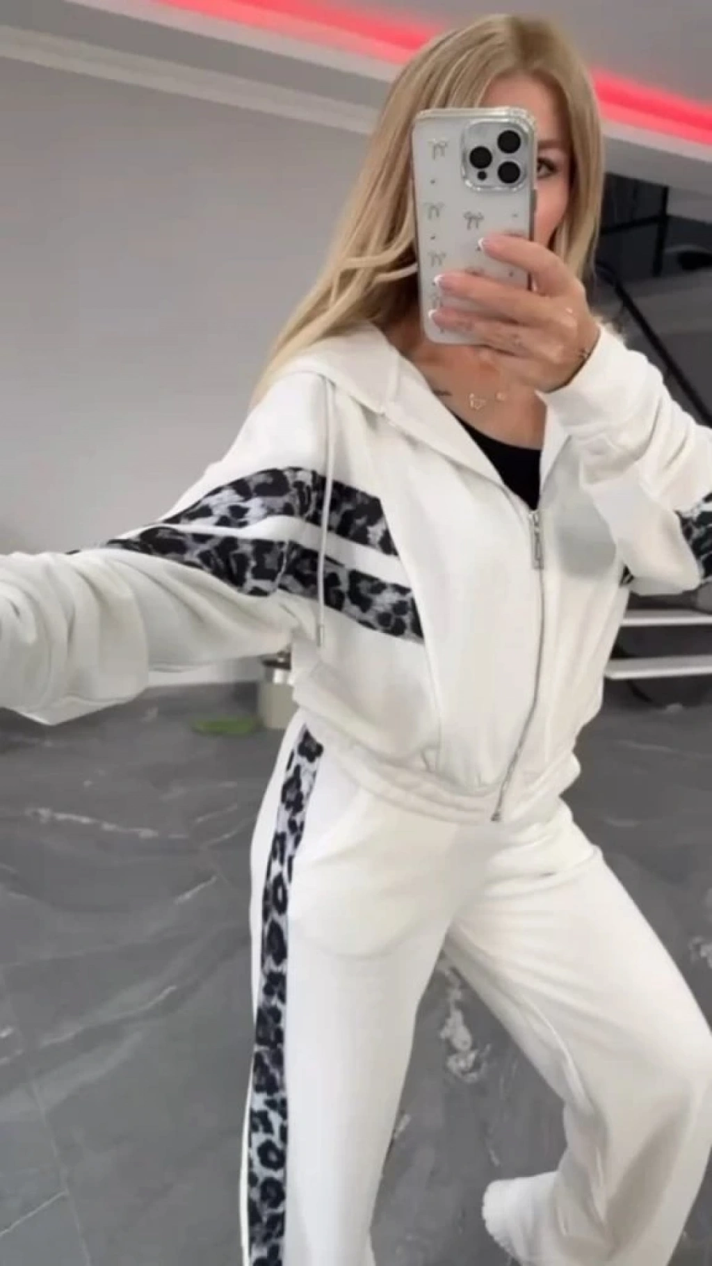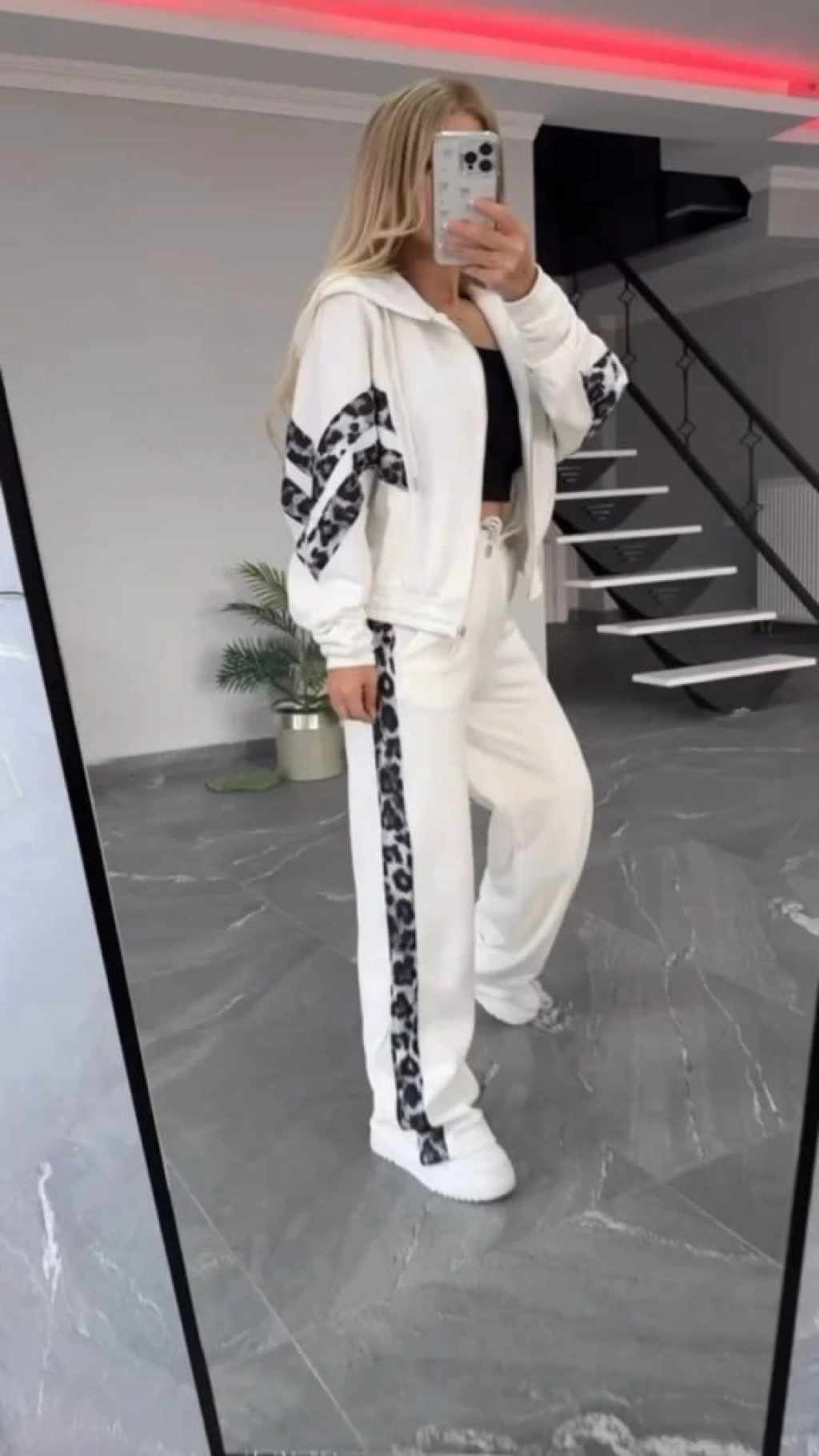 Kadın Uzun Kollu Kapşonlu önü Fermuarlı Leopar Desenli Modal Bluz Ve Pantolon Ikili Takım