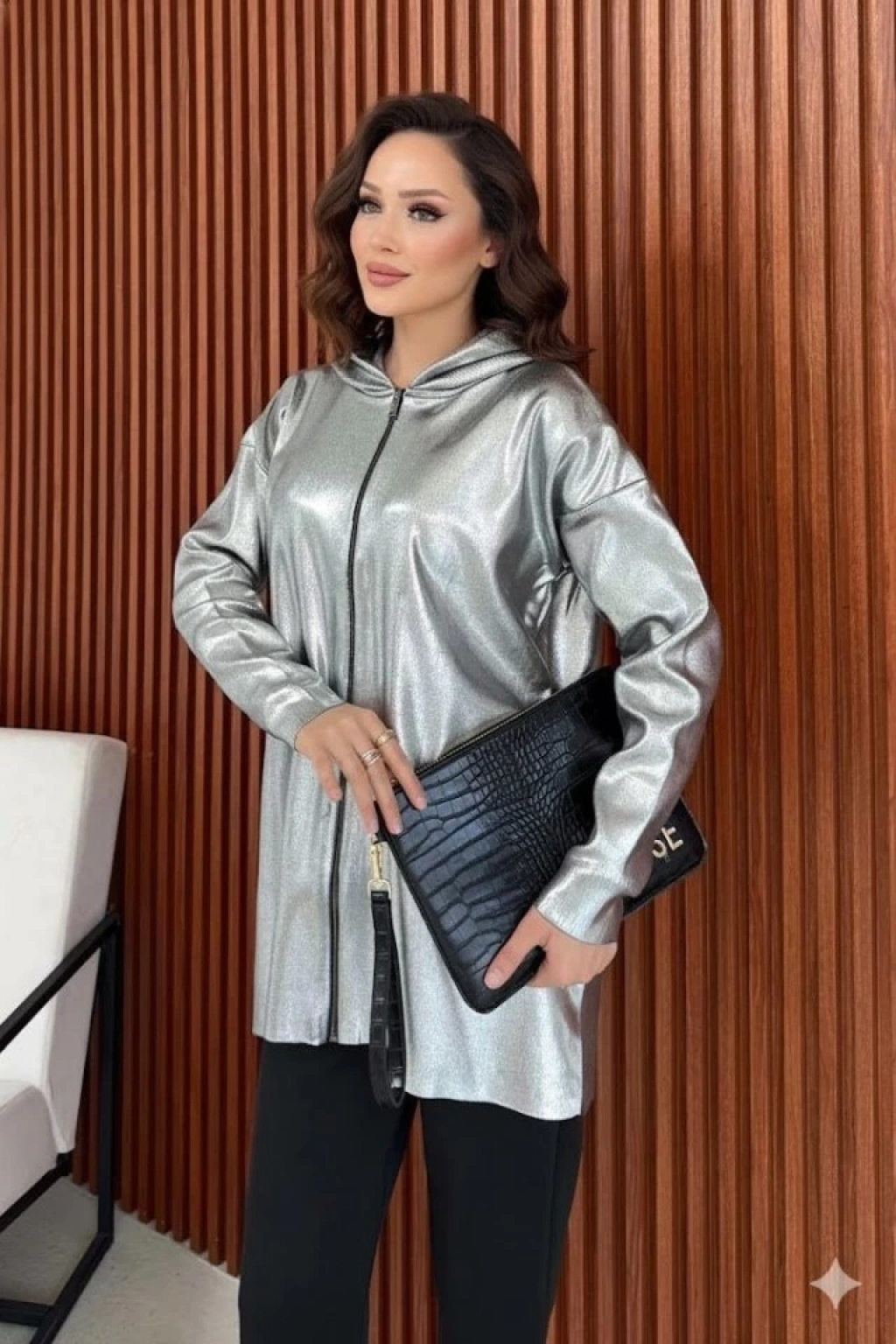 Kadın Uzun Kollu Kapüşon Detay Fermuarlı Tunik Hırka